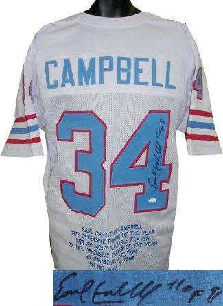 Earl Campbell was the first draft pick overall in the 1978 NFL Draft by the Houston Oilers, and in that year he was named the Offensive Rookie of the Year by the Associated Press as well as the Most Valuable Player. The Luv Ya Blue era in Houston was due mostly to Campbell's running ability and Coach Bum Phillips' "good ole boy" personality. Campbell possessed a rare combination of speed and power, and was a prolific running back from 1978 through 1985. His outstanding single-season performance in 1979 earned him All-Pro, Pro Bowl, and NFL Offensive Player of the Year honors. Earl Campbell has hand autographed this Houston Oilers White TB Prostyle Jersey with HOF 91 inscription and with Embroidered Stats. JSA Hologram and Certificate of Authenticity.