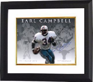 Earl Campbell was the first draft pick overall in the 1978 NFL Draft by the Houston Oilers, and in that year he was named the Offensive Rookie of the Year by the Associated Press as well as the Most Valuable Player. The Luv Ya Blue era in Houston was due mostly to Campbell's running ability and Coach Bum Phillips' "good ole boy" personality. Campbell possessed a rare combination of speed and power, and was a prolific running back from 1978 through 1985. His outstanding single-season performance in 1979 earned him All-Pro, Pro Bowl, and NFL Offensive Player of the Year honors. Earl Campbell has hand autographed this Houston Oilers/Texas Longhorns 16x20 Photo Career Collage. Certificate of Authenticity from Athlon Sports. Custom White Mat and Premium Black Color Framed as shown