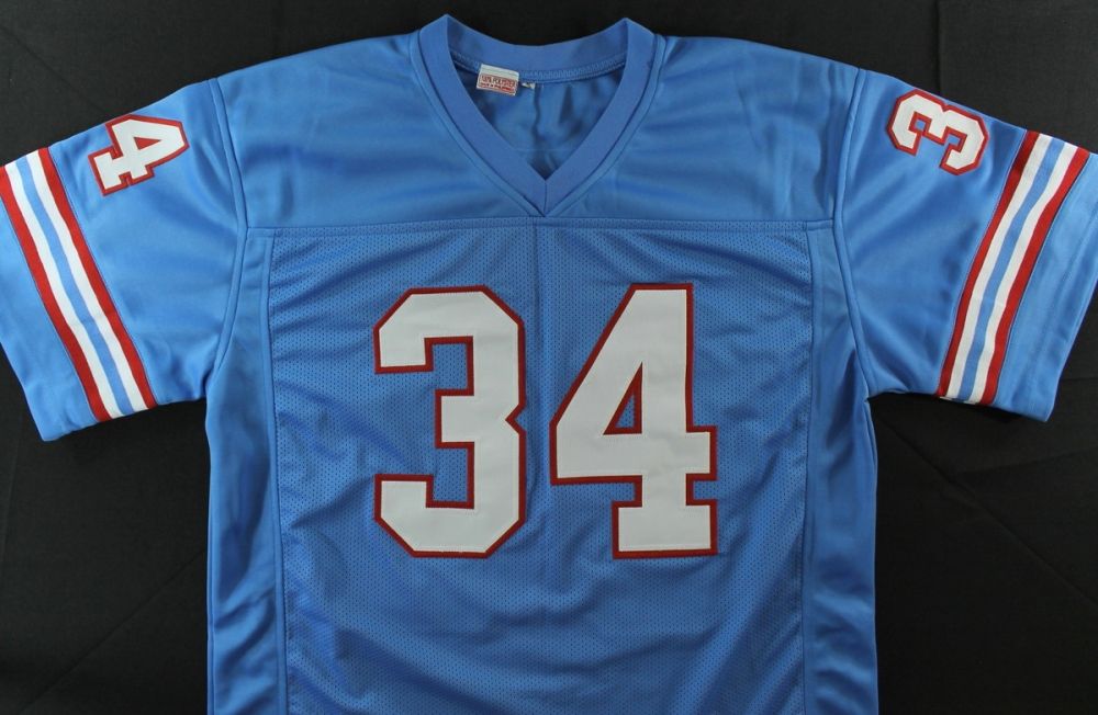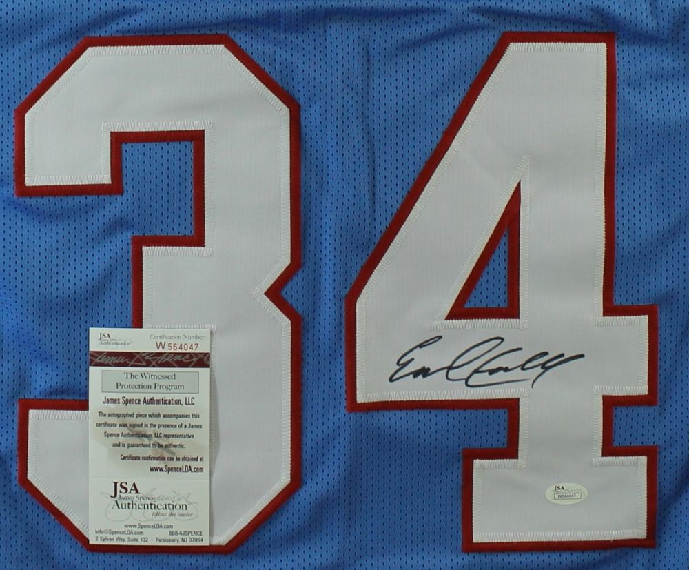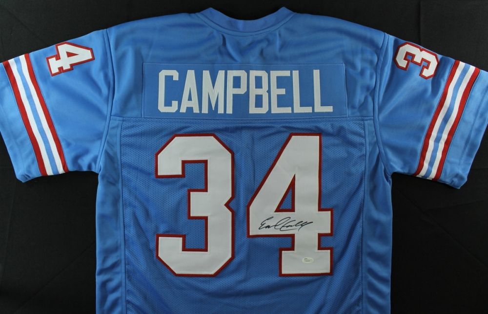 Custom on-field style jersey. Everything is sewn on, size XL. Hand-signed in black felt tip pen by Earl Campbell. The autograph includes an official James Spence Authentication (JSA) hologram and matching COA for authenticity purposes. The signing of this item was witnessed by JSA.