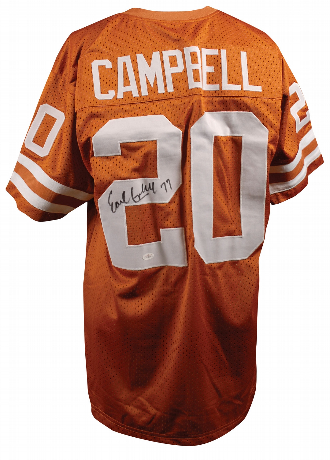 Official replica University of Texas Longhorns football jersey, with sewn on letters and numbers, signed in black felt tip on the number on the back, “Earl Campbell 77.” In very fine condition. Accompanied by a certificate of authenticity from James Spence.