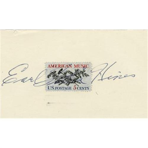 <B>Earl "Fatha" Hines Autograph.</B></I> A 5" x 3" card, with a five-cent stamp affixed, signed by the celebrated Jazz pianist in black ink. Hines' autograph extends across the face of the stamp and is large and clean. In Very Fine condition with a .25" tear to the upper left corner and a very small ink smudge under the autograph (neither affect signature).<BR><BR><b>Shipping:</b> Flat Material, Small (<a target="_blank" href="http://www.heritageauctions.com/common/shipping.php">view shipping information</a>)