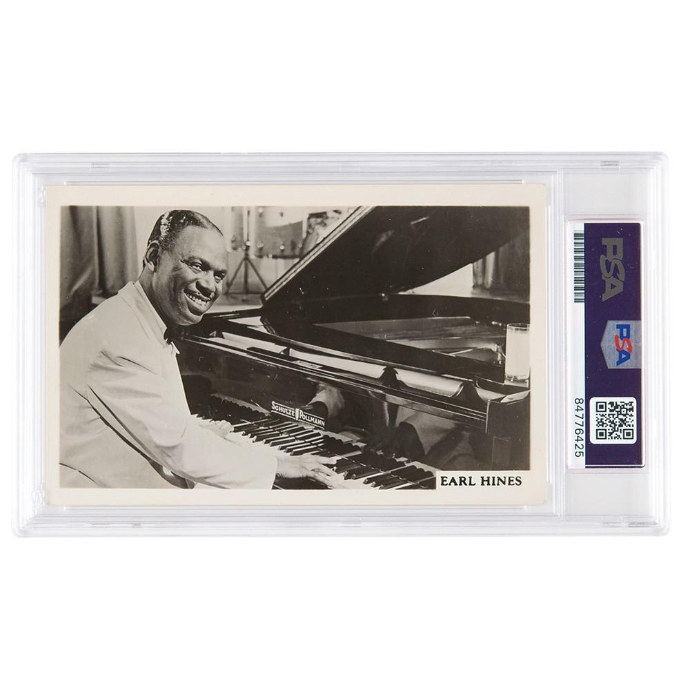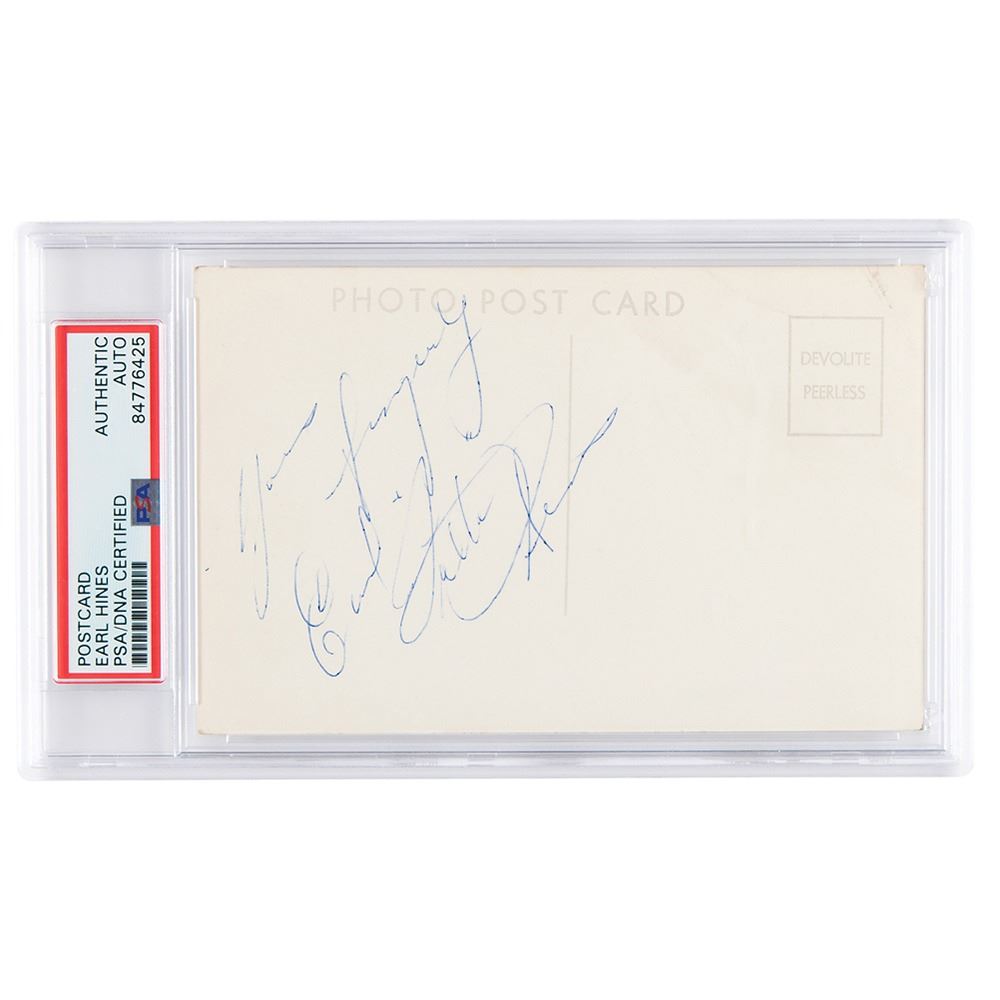 American jazz pianist and bandleader (1903-1983), who is considered one of the most influential figures in the development of jazz piano; his big band during the late 1920s consisted of legendary players like Dizzy Gillespie and Charlie Parker. Bandleader Count Basie once said that Hines was, & #39;the greatest piano player in the world.& #39; Vintage glossy 5.5 x 3.5 postcard photo of Hines seated and smiling at his Schulze Pollmann piano, signed on the reverse in ballpoint, "Yours fingerly, Earl & #39;Fatha& #39; Hines." In fine condition. Encapsulated in a PSA/DNA authentication holder.