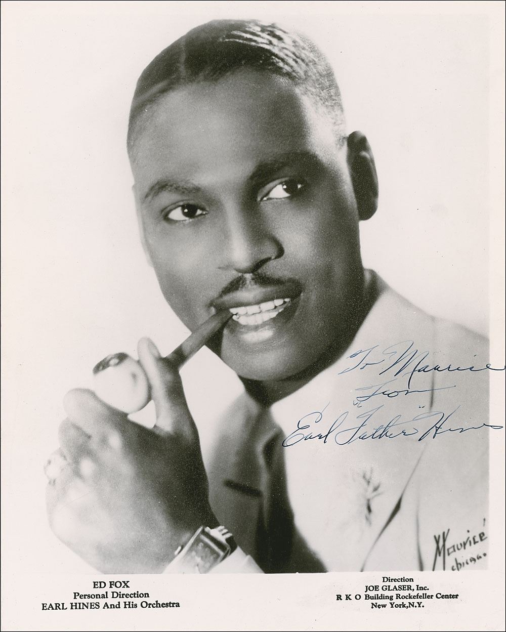 Vintage pearl-finish 8 x 10 promotional photo of Hines smoking a pipe, signed and inscribed in fountain pen, "To Maurice, From Earl 'Father' Hines." Affixed to a same-size cardstock mount. In fine condition.