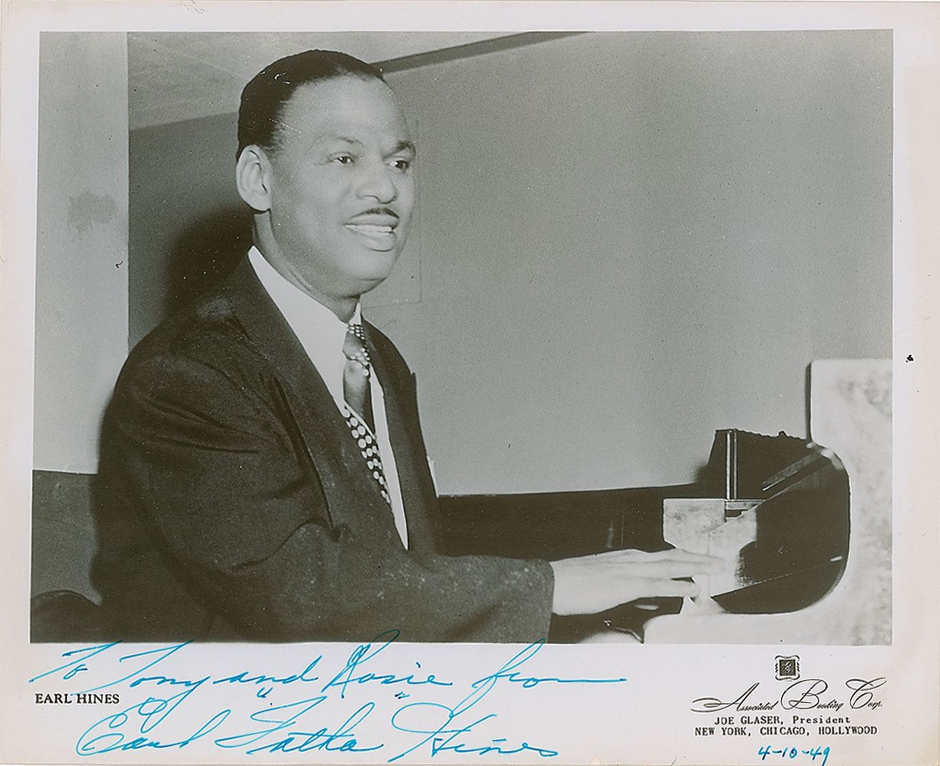 Vintage glossy 10 x 8 promotional photo of Hines smiling at his piano, signed and inscribed in blue ink, "To Tony and Rosie from Earl 'Fatha' Hines.” Collector's notation to lower border dates the signature to April 10, 1949. In fine condition.