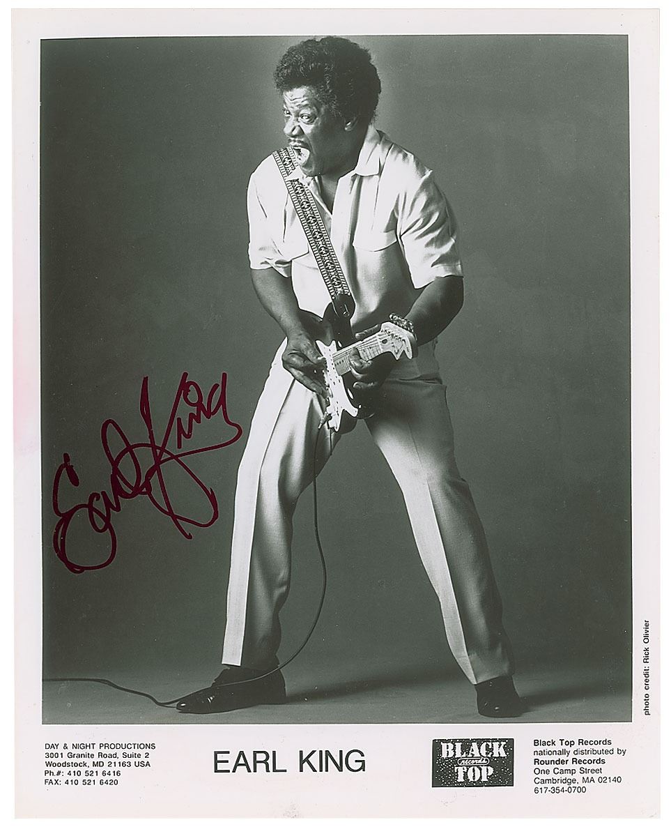 Blues singer and guitarist (1934–2003) known as the composer of songs like 'Come On' and 'Big Chief.' Glossy 8 x 10 Blacktop Records publicity photo of King playing his Stratocaster, signed in red felt tip. In fine condition.