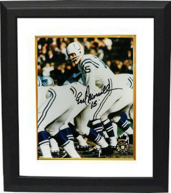 When regular Colts signal caller Johnny Unitas was injured in the final exhibition game, Earl Morrall became the team's starter. Morrall proceeded to lead the Colts to a 13-1 record, then added two playoff victories en route to winning the NFL's Most Valuable Player award, leading the Colts into Super Bowl III. Earl Morrall has hand autographed this Baltimore Colts 8x10 Photo with #15. Certificate of Authenticity from Athlon Sports. Custom White Mat and Premium Black Color Framed as shown.