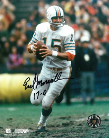 On April 25, 1972, Earl Morrall was claimed on waivers for $100 by the Miami Dolphins, reuniting him with his former Colt head coach, Don Shula.Morrall replaced the injured Bob Griese for the Dolphins during the team's October 15 win over the San Diego Chargers. The victory gave Miami a 5-0 record, with Morrall building on that win to lead the team to the first undefeated regular season in the NFL since 1942 and only undefeated season ever, starting 11 out of 17 games that year. Earl Morrall has hand autographed this Miami Dolphins 8x10 Photo with 17-0 inscription. Certificate of Authenticity from Athlon Sports.