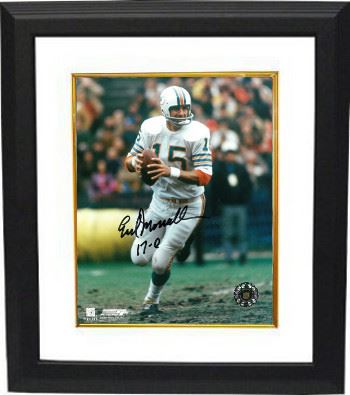 On April 25, 1972, Earl Morrall was claimed on waivers for $100 by the Miami Dolphins, reuniting him with his former Colt head coach, Don Shula.Morrall replaced the injured Bob Griese for the Dolphins during the team's October 15 win over the San Diego Chargers. The victory gave Miami a 5-0 record, with Morrall building on that win to lead the team to the first undefeated regular season in the NFL since 1942 and only undefeated season ever, starting 11 out of 17 games that year. Earl Morrall has hand autographed this Miami Dolphins 8x10 Photo with 17-0 inscription. Certificate of Authenticity from Athlon Sports. Custom White Mat and Premium Black Color Framed as shown.