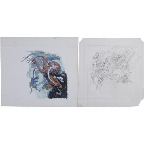 <B>Earl Norem - Fantastic Four: Island of Danger Illustration Original Art, Group of 6 (Marvel Books, 1984).</B></I> The Fantastic Four mix it up with a tsunami wave and an outraged octopus, while the Thing lets loose with a thunderous clap. This lot features three fully-painted scenes and their matching pencil on vellum preliminary drawings. These pieces have an average overall size of 15" x 16" . The painted pieces have been separated and removed from their illustration board backings, while the pencil drawings have some pieces out of their corners; otherwise, the art averages Very Good condition.<BR><BR><b>Shipping:</b> Flat Material, Small (<a target="_blank" href="http://www.heritageauctions.com/common/shipping.php">view shipping information</a>)
