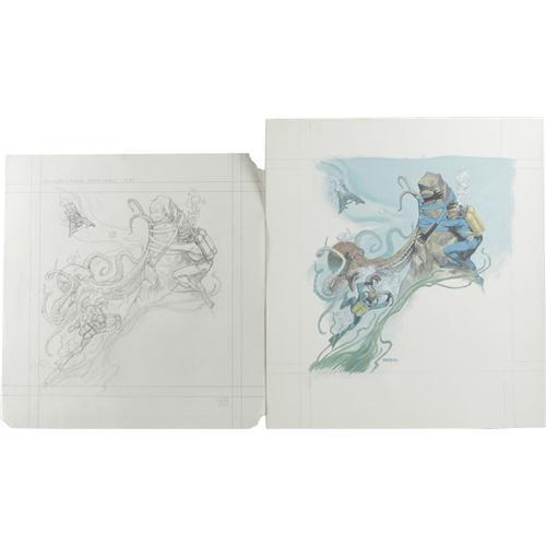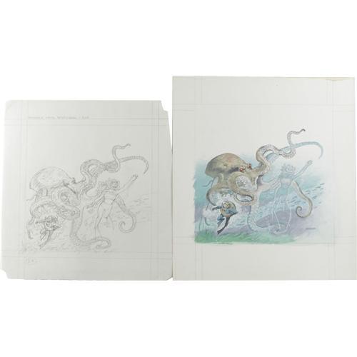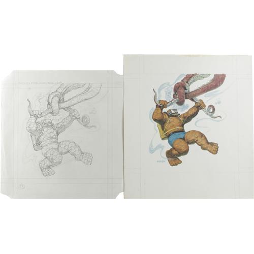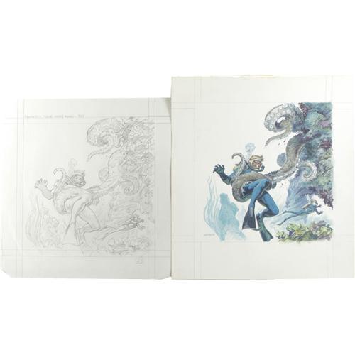 <B>Earl Norem - Fantastic Four: Island of Danger Illustration Original Art, Group of 8 (Marvel Books, 1984).</B></I> It's clobberin' time as each member of the Fantastic Four battles an irate octopus in this lot of four painted illustrations, along with their matching pencil preliminaries. The painted pieces have been separated and removed from their illustration board backings, while the pencil drawings have some pieces out of their corners; otherwise, the art averages Very Good condition.<BR><BR><b>Shipping:</b> Flat Material, Small (<a target="_blank" href="http://www.heritageauctions.com/common/shipping.php">view shipping information</a>)