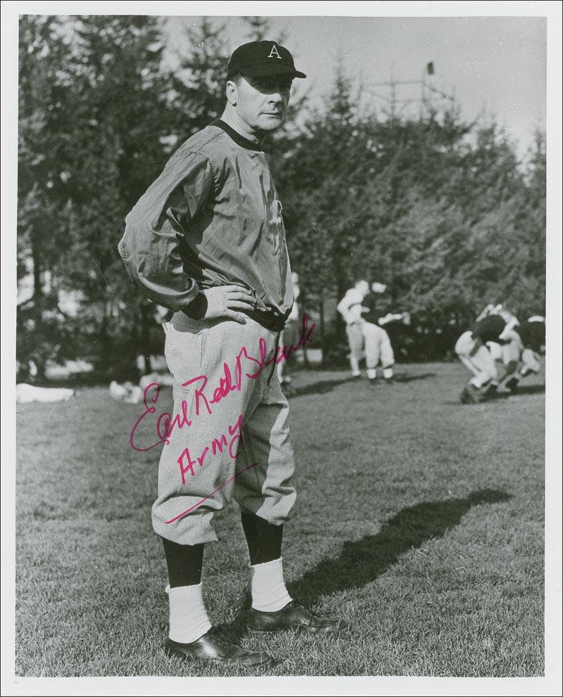 Legendary Army football coach and College Football Hall of Famer (1897–1989) who, during his long tenure at the US Military Academy, won consecutive national titles in 1944 and 1945 and coached three Heisman trophy winners. Glossy 8 x 10 photo of Blaik on the field during an Army practice, appropriately signed in red felt tip, “Earl ‘Red’ Blaik, Army.” In fine condition, with a few tiny creases.