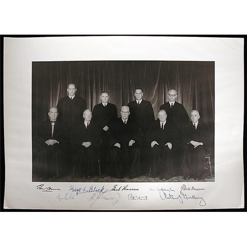 <Our item number 139900><B>Warren Earl - Signed Photograph of All Nine Members of the Court.</B> Formal 12 x 17 in. portrait of the U.S. Supreme Court justices, c. 1963, signed by Chief Justice Earl Warren, as well as by associate justices Tom C. Clark, Hugo L. Black, William O. Douglas, John M. Harlan, Bryon White, William J. Brennan, Potter Stewart, and Arthur J. Goldberg. The photographer was J. Ackad, Washington. Fine condition; a couple of corner creases affect nothing. <BR>Estimated Value $1,500 - 2,500. <BR><BR>Our item number 139900<BR><IMAGES><P ALIGN="CENTER"><IMG SRC="http://www.goldbergcoins.net/liveauction/49jpegs/139900.jpg"> </P></IMAGES>