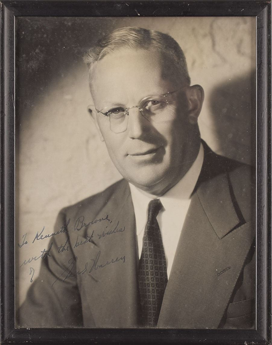 Vintage matte-finish 7 x 9 photo of Warren in a suit and tie, signed and inscribed in fountain pen, "To Kenneth Browne, with the best wishes of Earl Warren.” Framed and in fine condition.