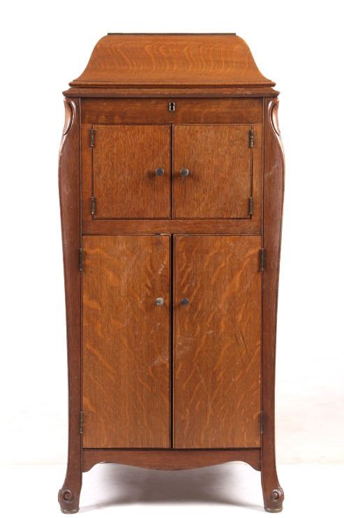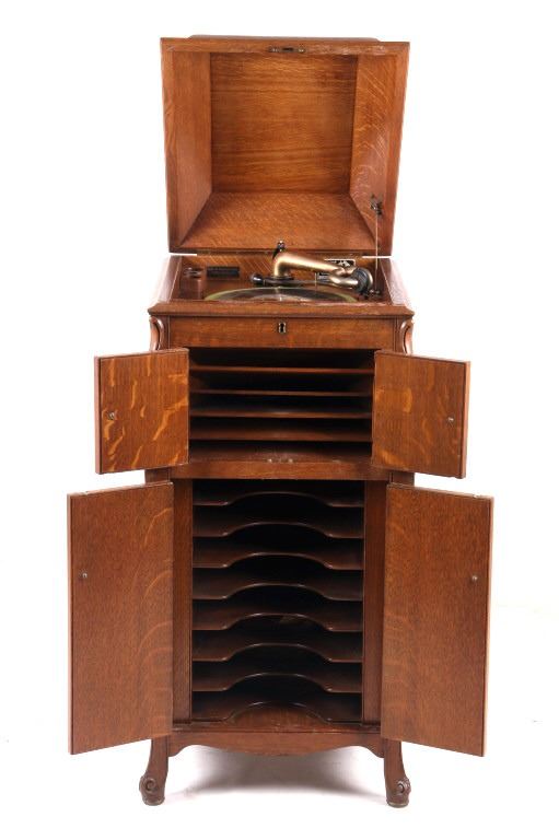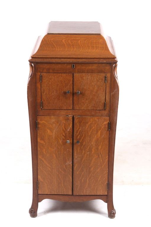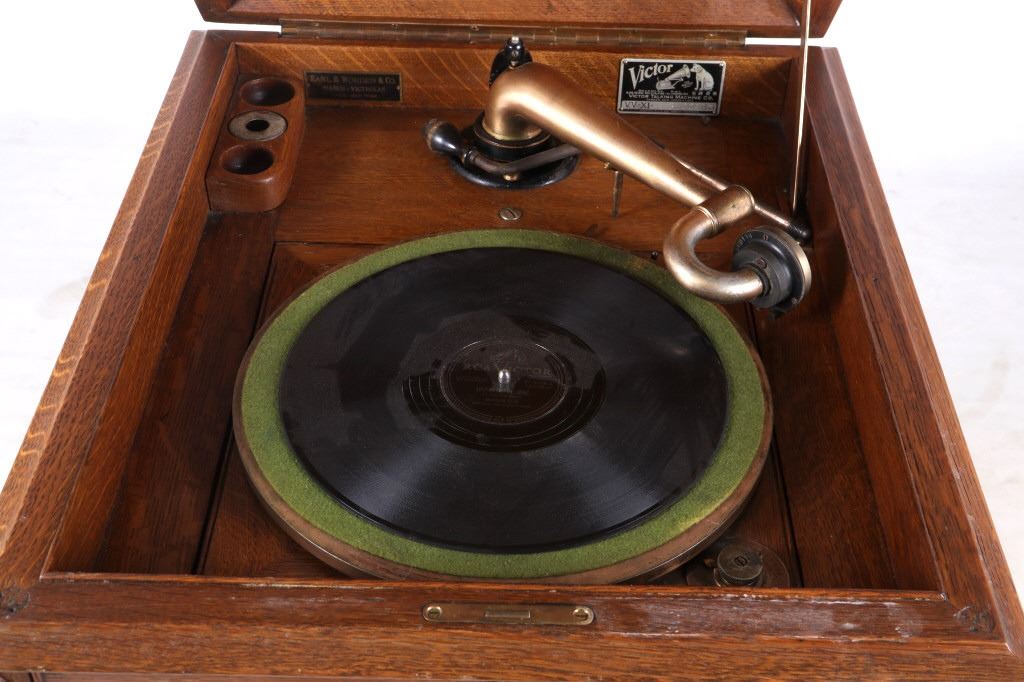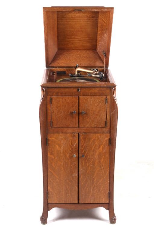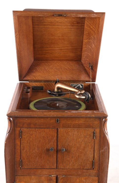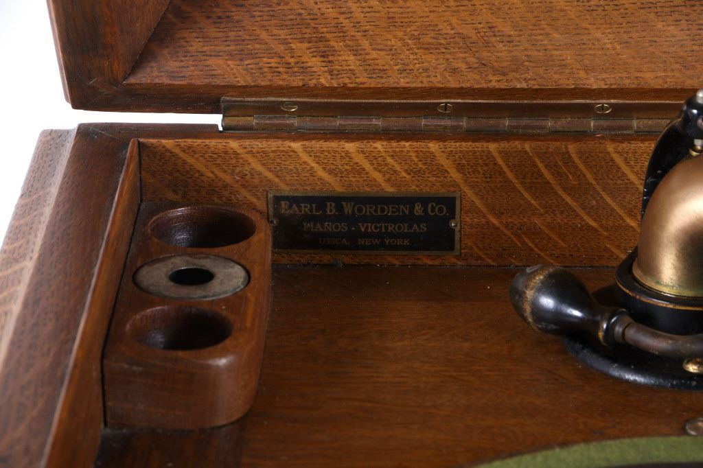 Featured in this lot we have an Earl Worden & Co Oak Victrola Cabinet & Player originating from the early 1900's. The Victrola was made by the Victor Talking Machine Co. of Camden, N.J. The Victrola features a solid oak console with beautifully carved legs. The top lifts to reveal the turntable and storage for the needles. The piece was marked on the left interior with a metal plaque reading "Earl Worden & Co. Pianos & Victrolas". The piece was marked on a metal plaque reading on the right reading "Victor - Victor Talking Machine Co.". The smaller doors on the front open to project sound. The larger doors open for storage of records. The Victrola shows good condition. The piece shows good condition overall with some light wear. The cabinet measures 43" tall by 23 1/2" deep and 20" wide.