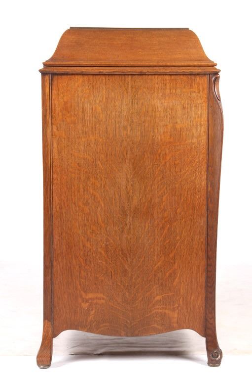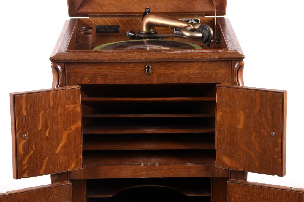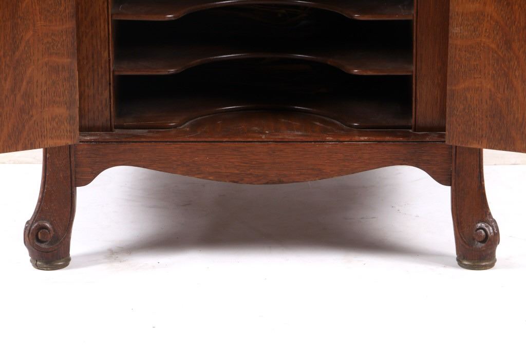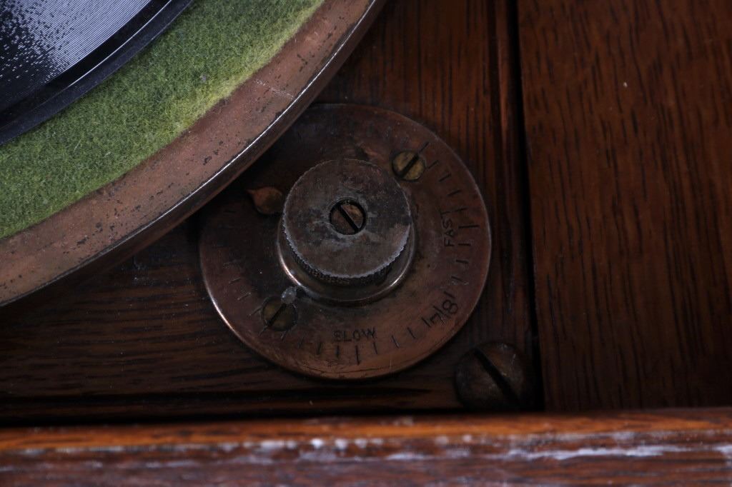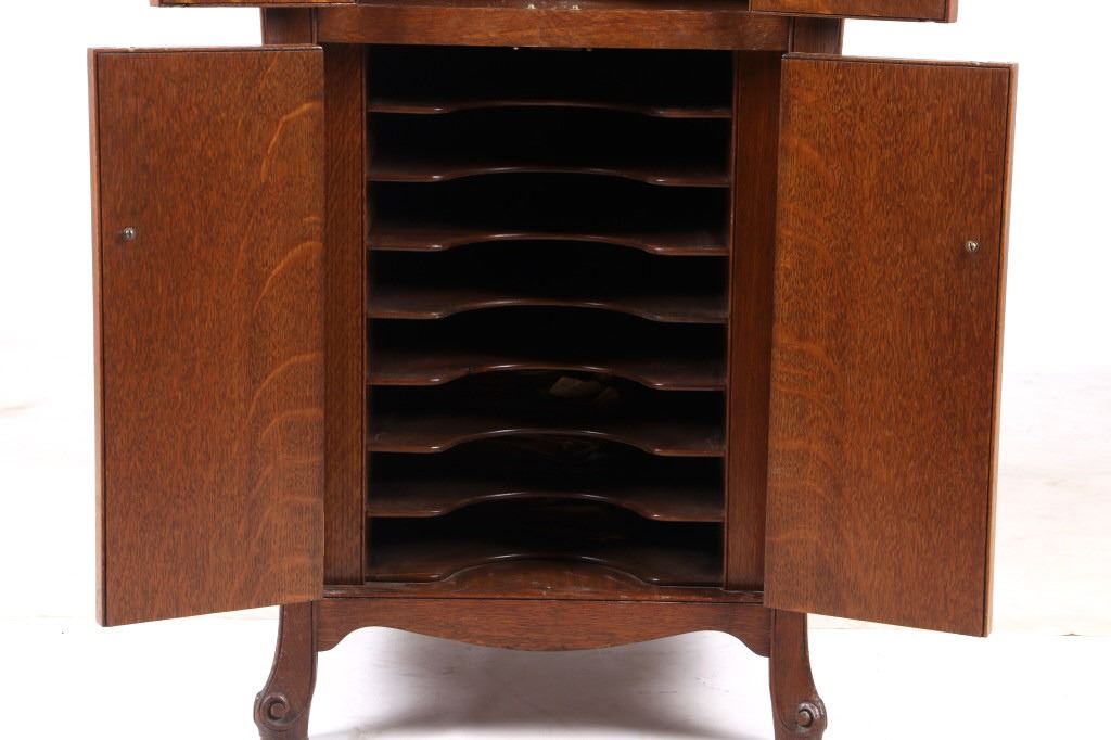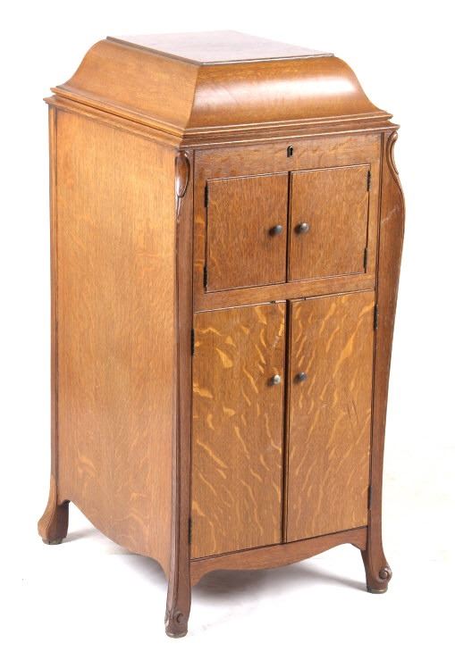 Featured in this lot we have an Earl Worden & Co Oak Victrola Cabinet & Player originating from the early 1900's. The Victrola was made by the Victor Talking Machine Co. of Camden, N.J. The Victrola features a solid oak console with beautifully carved legs. The top lifts to reveal the turntable and storage for the needles. The piece was marked on the left interior with a metal plaque reading "Earl Worden & Co. Pianos & Victrolas". The piece was marked on a metal plaque reading on the right reading "Victor - Victor Talking Machine Co.". The smaller doors on the front open to project sound. The larger doors open for storage of records. The Victrola shows good condition. The piece shows good condition overall with some light wear. The cabinet measures 43" tall by 23 1/2" deep and 20" wide.