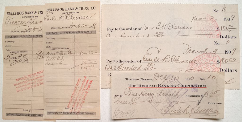 1909-1910. Lot of five. Two Bullfrog Bank & trust deposits. Two Bullfrog Bank & Trust pay to the order of. One Tonopah Banking Corporation. Clemens began the Pioneer Press at the Herald plant in Rhyolite on 18 February 1909. The Pioneer was a four page Saturday issue weekly that was the rival of Theodore Lowe's Pioneer Papers which ran a Wednesday issue weekly. Both were in competition for the mining camp of Pioneer, NV. The papers and the camp both went belly up by July.