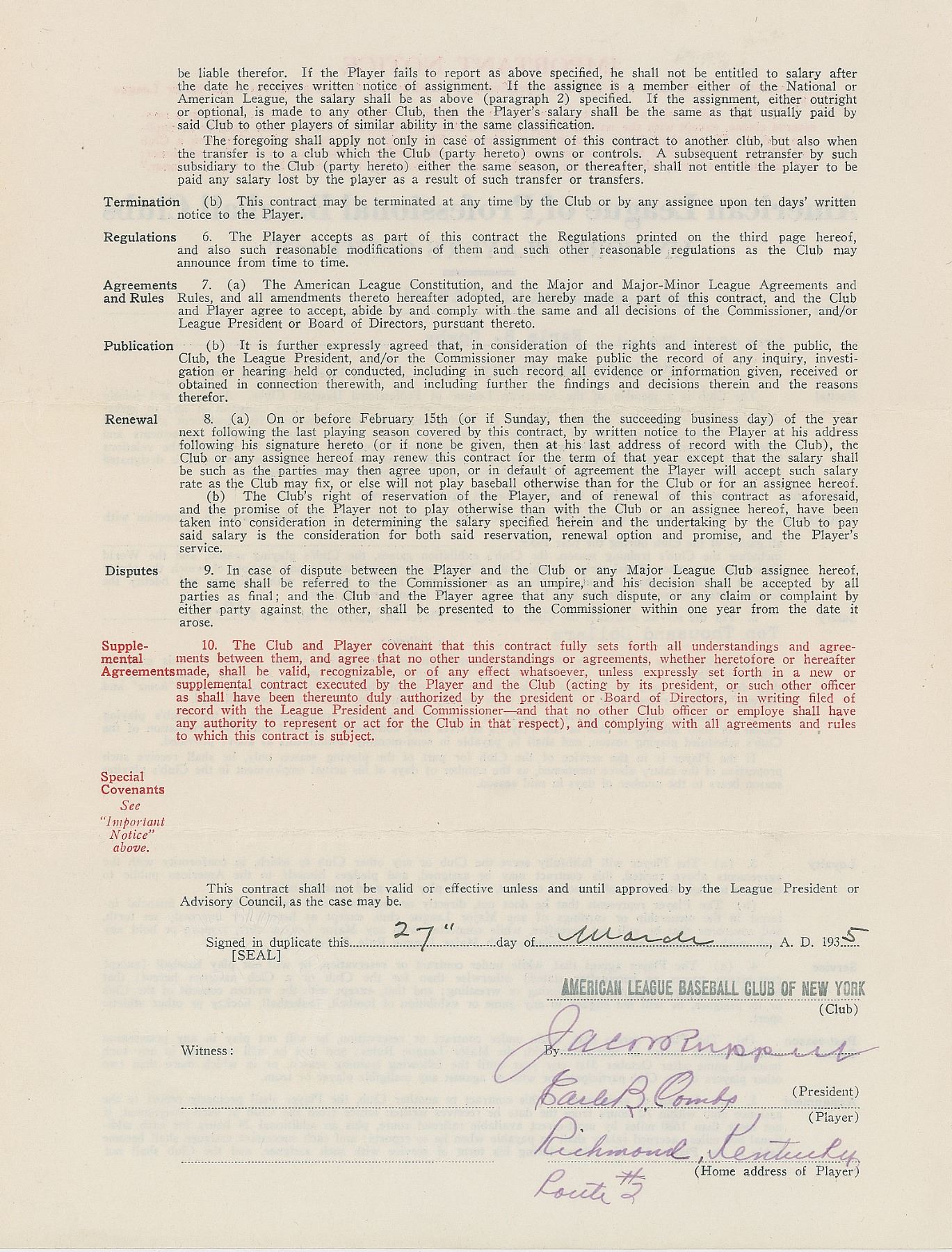 Contract, signed “Earle B. Combs,” four pages on two adjoining sheets, 8.5 x 11, March 27, 1935. American League uniform player's contract in which Earle Combs agrees to render "skilled service as a baseball player in connection with all games of the Club during the year 1935" for the New York Yankees, for a salary of $10,000. Signed at the conclusion in fountain pen by Combs, who adds his address below, “Richmond, Kentucky, Route #2,” and countersigned by Yankees Owner Jacob Ruppert. The reverse is signed by American League President William Harridge. In fine condition.