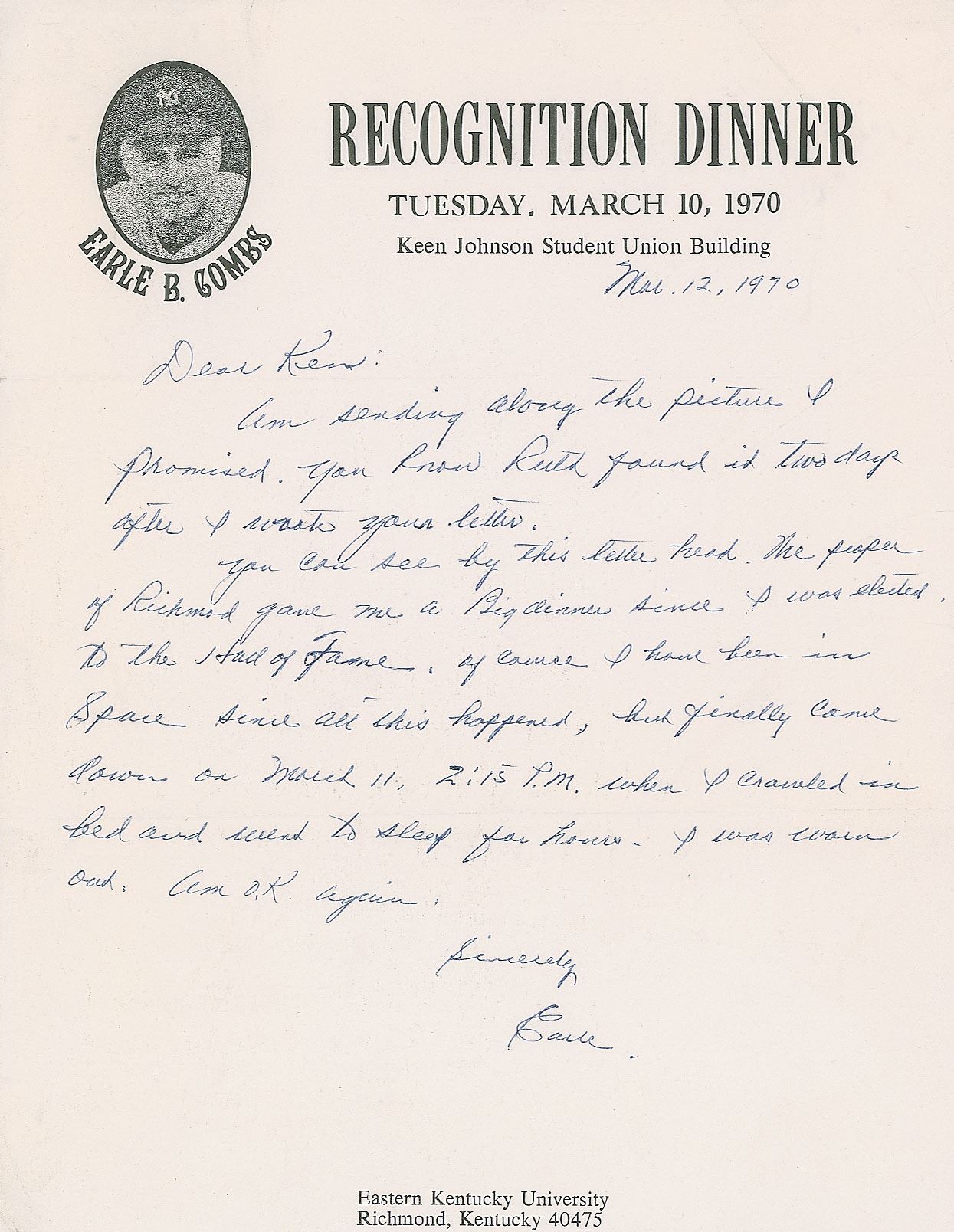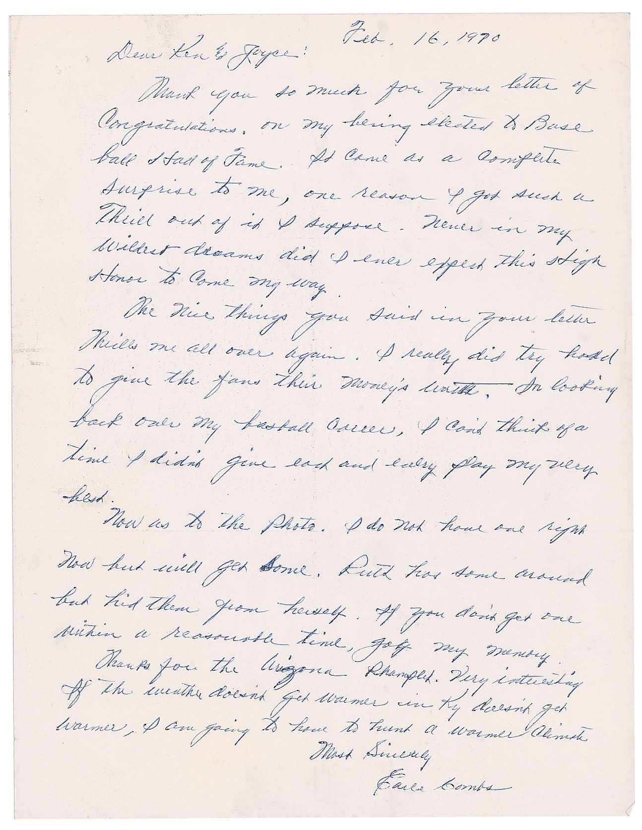 Three items: a glossy 5 x 7 photo of Combs in his New York Yankees uniform, signed in blue ballpoint, "Earle Combs"; an ALS signed "Earle Combs," one page, 8.5 x 11, February 16, 1970, in part: "Thank you so much for your letter of Congratulations, on my being elected to Baseball Hall of Fame. It came as a complete surprise to me, one reason I got such a Thrill out of it I suppose. Never in my wildest dreams did I ever expect this High Honor to come my way…I really did try hard to give the fans their money's worth. In looking back over my baseball career, I can't think of a time I didn't give each and every play my very best"; and an ALS signed "Earle," one page, 8.5 x 11, Earle B. Combs Recognition Dinner letterhead, March 12, 1970, in part: "Am sending along the picture I promised…You can see by this letter head. the people of Richmond gave me a Big dinner since I was elected to the Hall of Fame, of course I have been in Space since all this happened." In overall very good to fine condition, with spotty irregularity to the photo's emulsion. Accompanied by one original mailing envelope, addressed in Combs's hand.