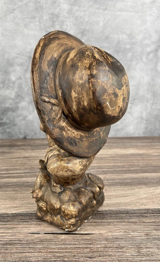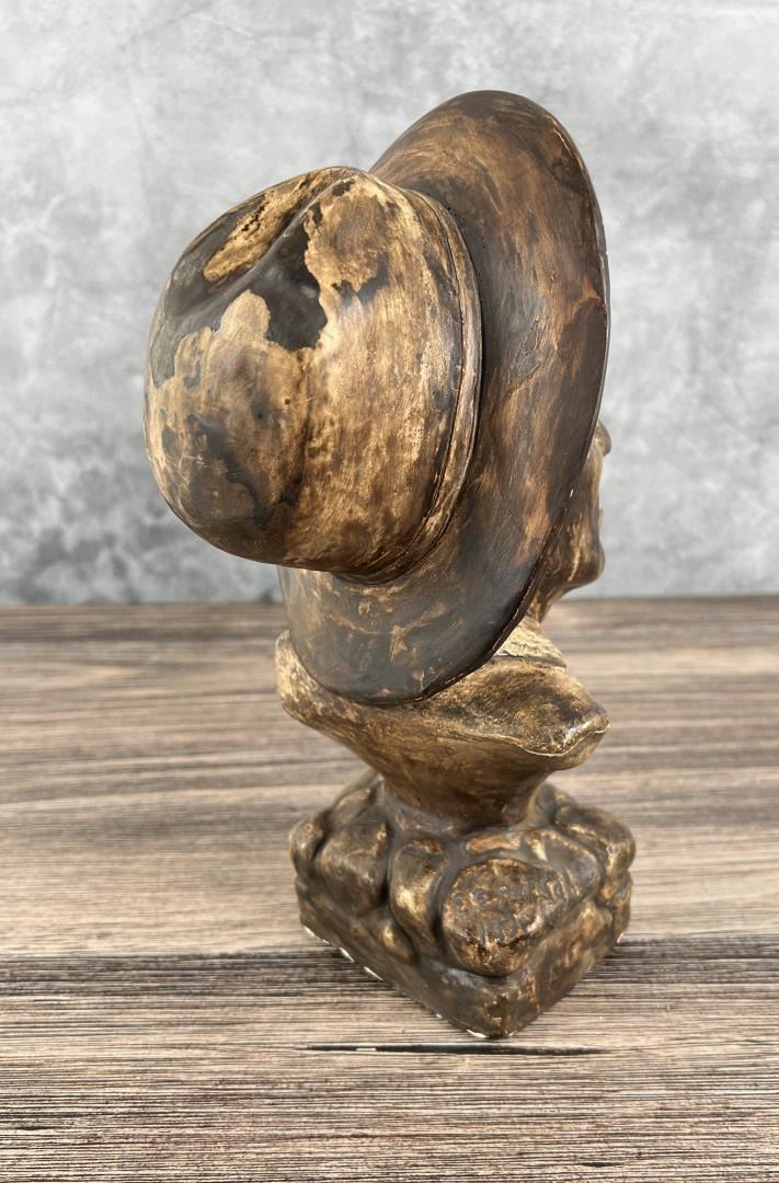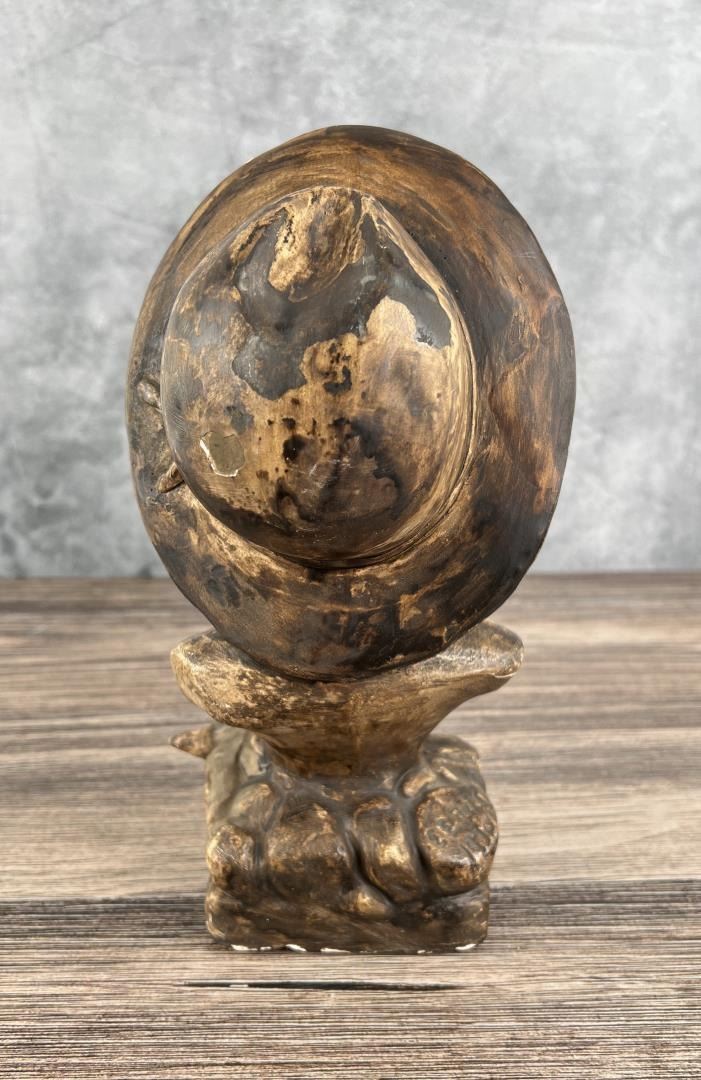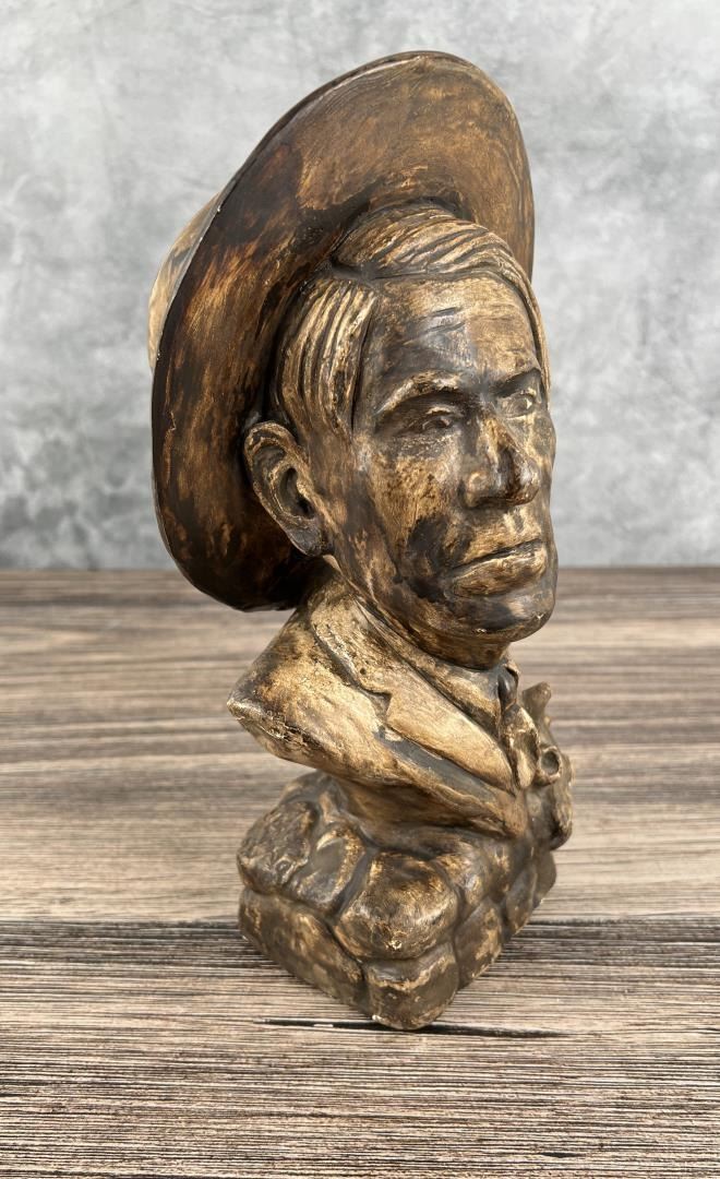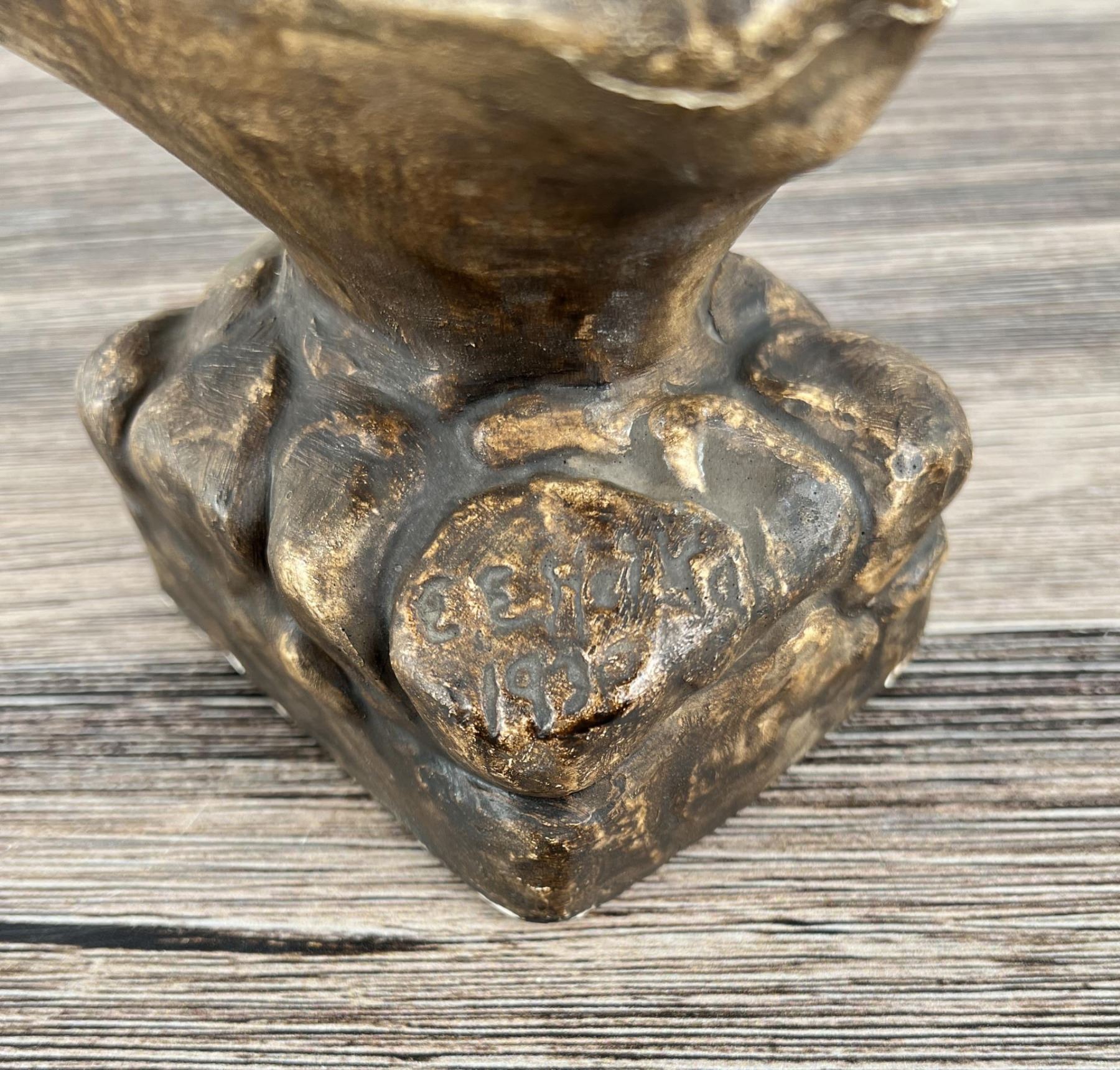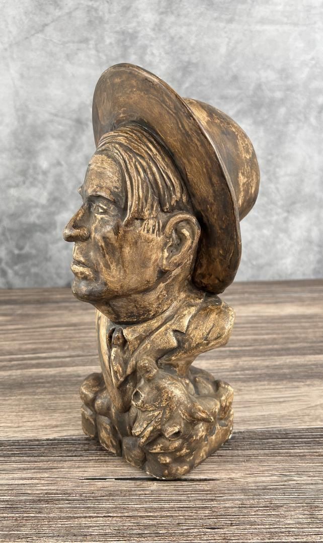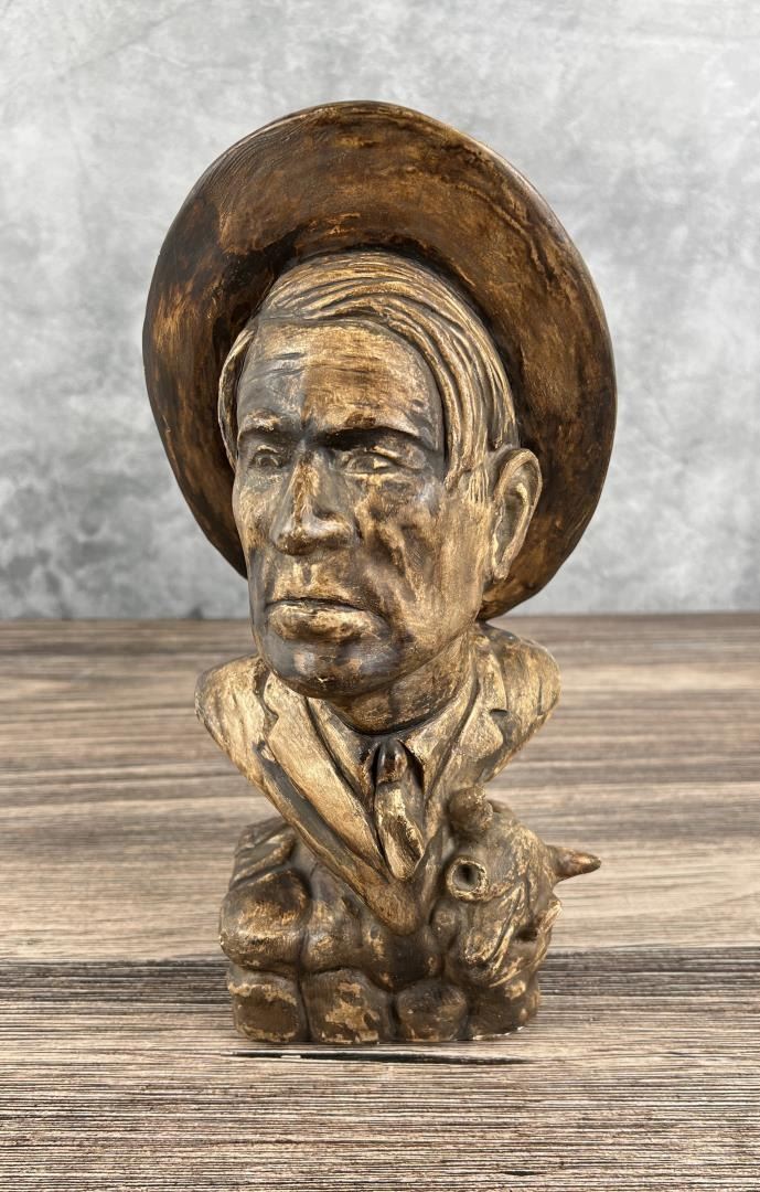 11" by 5 5/8" by 5 1/8". Title Is Charles M Russell. This is the one of a kind plaster model used to cast the bronze. In 1963 Joe De Yong Charles M. Russell's only protege wrote a tribute to Earl E. Heikka, "What has received far less attention than deserved is the wholly untrained, yet artistically admirable quality of modeling that was produced in the all-too-short-lifetime of Earl Heikka of Great Falls." Heikka was born in Belt, Montana on May 3, 1910 to Finnish parents. When he was two years old, the family moved to Great Falls. He was only sixteen years-old when Charles Russell died, so it is uncertain how much time, if any, he observed Russell working in his studio in Great Falls. Like Russell, he learned a great deal about big game by hunting and packing. He also learned from spending time in Rumford’s Taxidermy Shop in Great Falls. Unfortunately, his most productive years were during the Great Depression when prices for all goods and services dropped dramatically. Spending on art for even the wealthy was greatly reduced until after WW II. Heikka worked with mainly water-based air drying clay known as Marblex and used solid wire armature anchored to a wooden base. Many of his models were then beautifully and finely painted before they were ready for sale. Best known for his pack train sculptures, often with a number of riders and horses that were designed for mantles in lodges, Heikka sculpted them as his tribute to Glacier National Park and the Rocky Mountains. His finest was Taking Up the Slack, and others included: Trophy Hunters, Bringing Home the Bacon, Sun River Packers, Hunter’s Return, Pack Train, Pack String, and Successful. He was also a master of predicament subjects such as Pursued. Heikka struggled for sales his entire shortened life. Like so many others during the brutal days of the Depression, he committed suicide on May 18, 1941 in Great Falls and left a young family behind. Only a number of years after he died were his models cast in bronze and his sculpting abilities better appreciated. Today, his sculptures are highly prized and collectible.