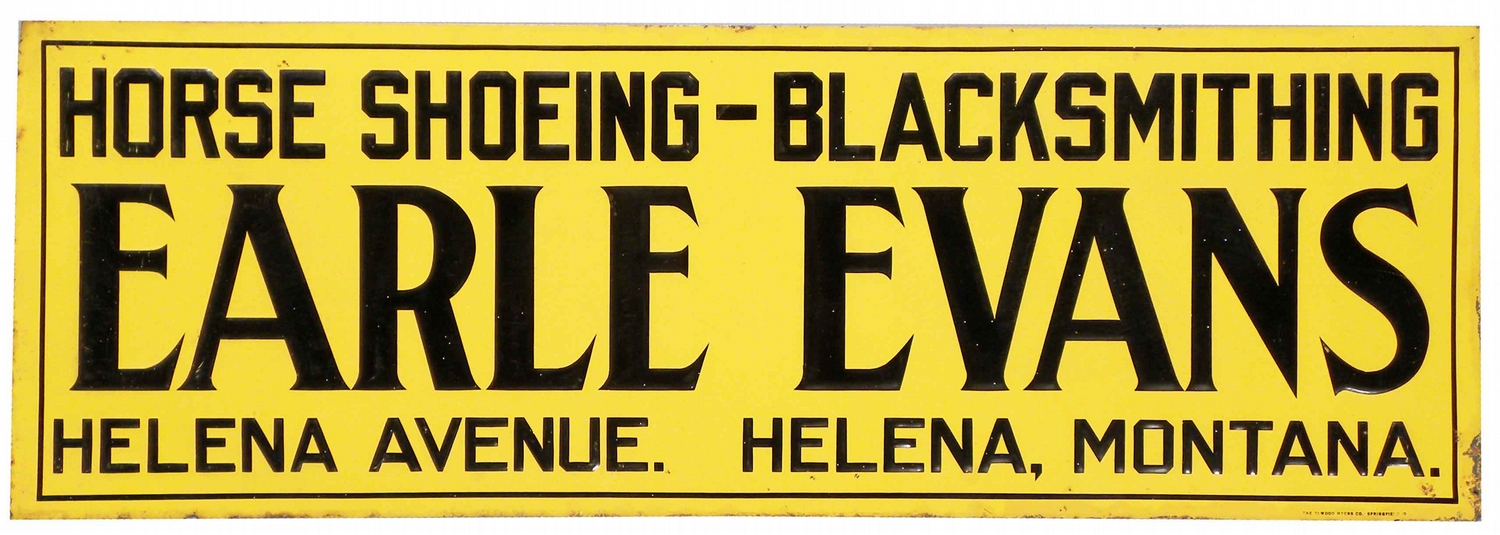 Earle Evans Embossed Tin Sign. Horshoeing and Blacksmithing. Helena, MT. Slight edge ware otherwise excellent condition. 20 X 6 3/4 inches.
