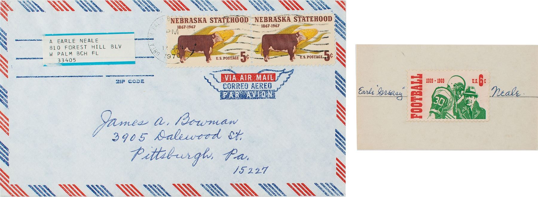 Ballpoint signature, "Earle 'Greasy' Neale,” on an off-white 3.5 x 2 card bearing an affixed postage stamp honoring the centennial of football. In fine condition. Accompanied by the original mailing envelope.