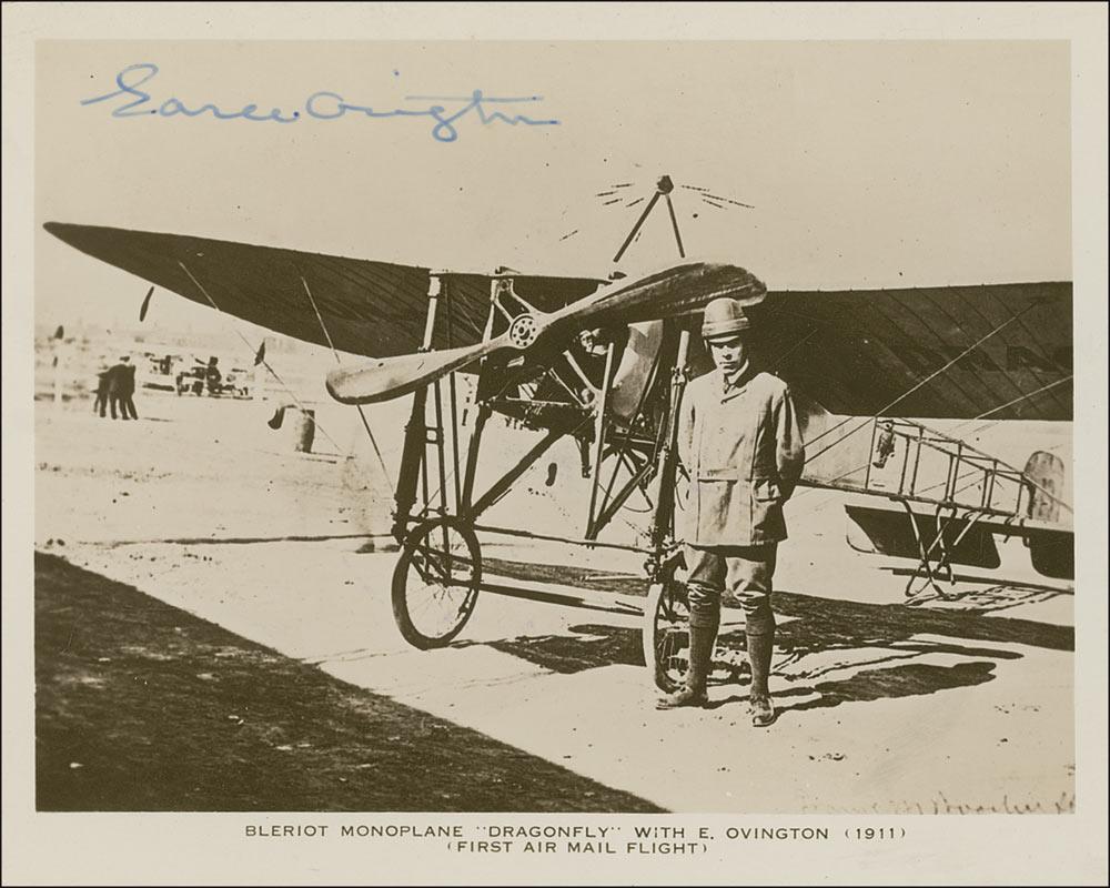 Former lab assistant to Thomas Edison (1879–1936) who, in 1911, made the first official airmail flight in the United States. Vintage 5 x 4 postcard photo of Ovington posing in front of his plane, signed in blue ink. Reverse bears a commemorative stamp honoring Ovington as the first air mail pilot. In fine condition, with a few light creases.