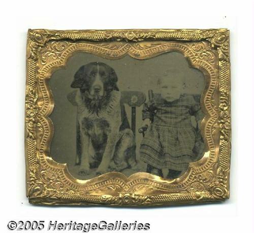 <B>Early 1/6th Plate Ferrotype of a Boy and His Dog</B></I> A darling photo of a very young child, sitting in a chair and staring intently into the camera with his <I>large</B></I> dog next to him doing exactly the same, sitting in a chair and staring into the camera. Superb, clear image in excellent condition, in a decorative metal period frame and under glass. Lot:251