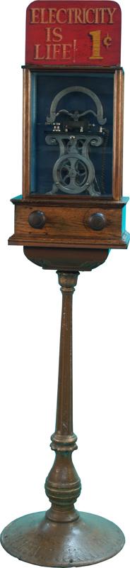 Early 1 Cent Wood & Glass Floor Model "Electricity Is Life!" Machine w/ keys