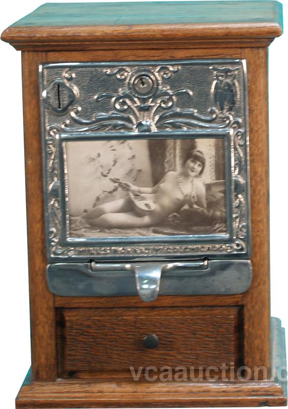 Early 1 Cent Wooden Countertop Nude Lady Card Vending Machine by Mills Novelty Co. Chicago, works (no cards)