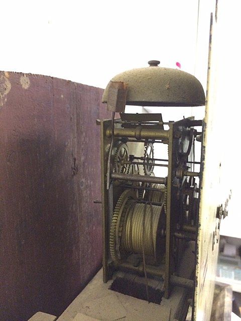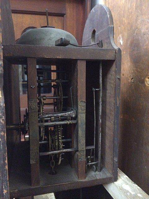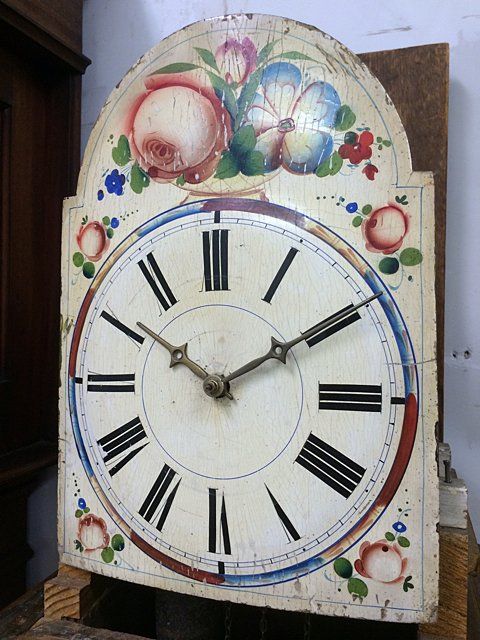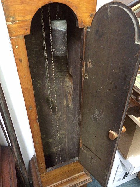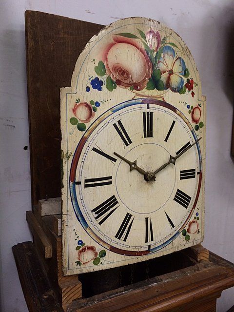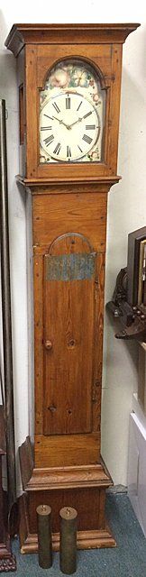 Early 1785 Country Grandfather Clock (could be called Grandmother Clock due to size), pine case with hand painted flowers on dial, date on front door, weights and pendulum, very nice early clock in nice size.