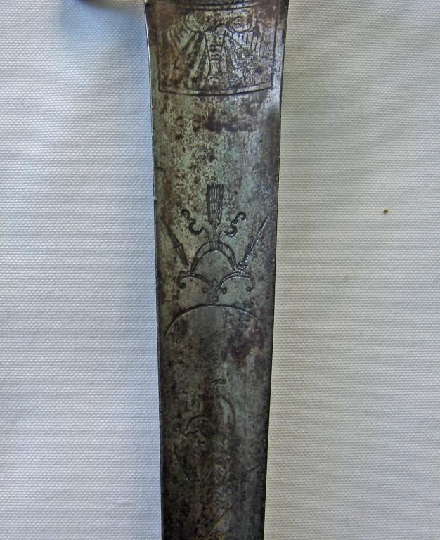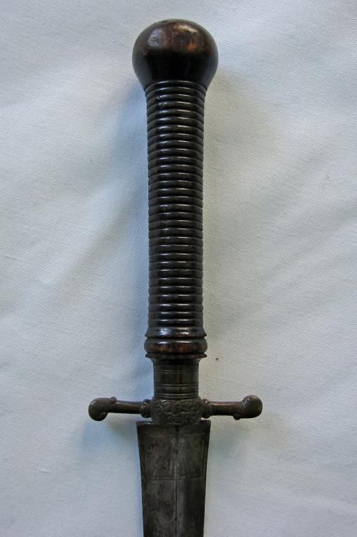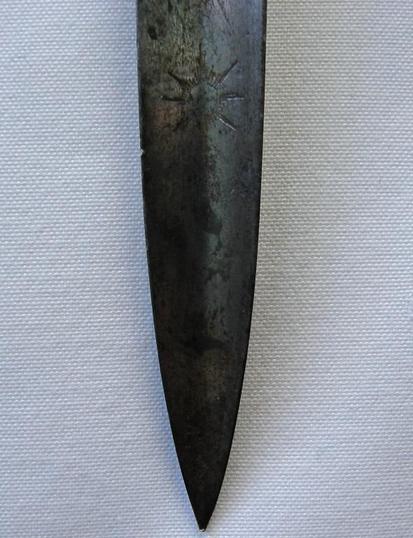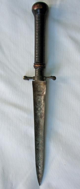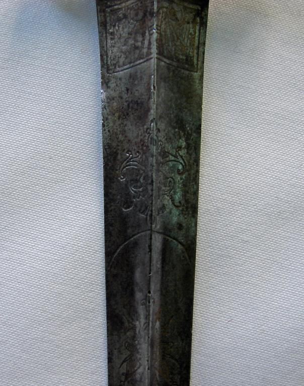 Early 17th Century German armor piercing triangular dirk with fine engraving and fabulous grip. Blade measures 8.5in, overall length 14.5in.