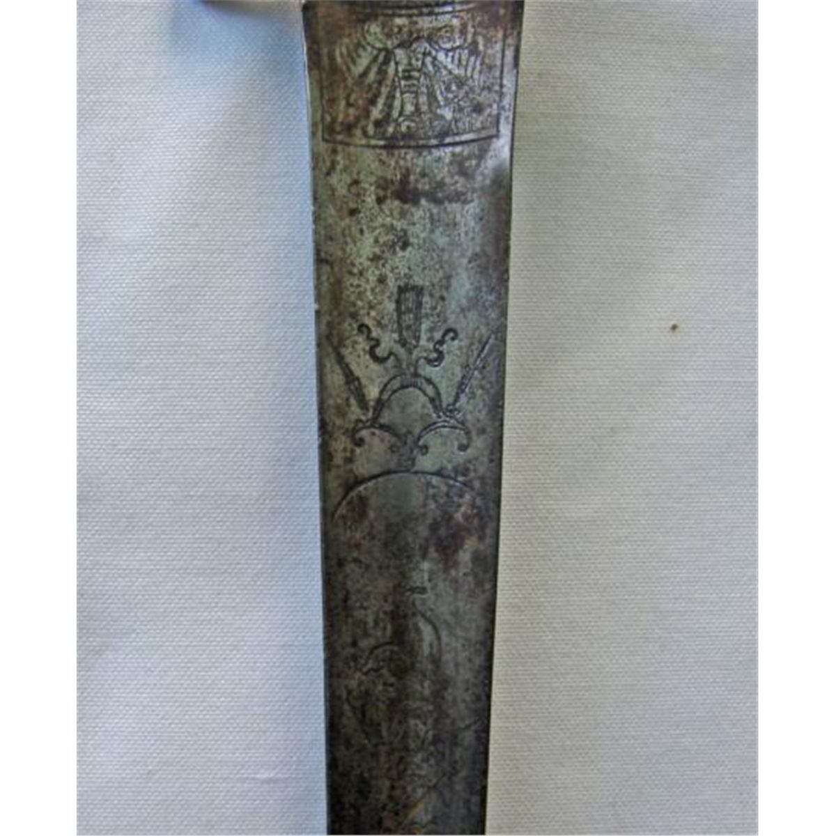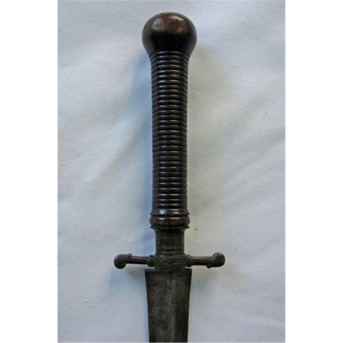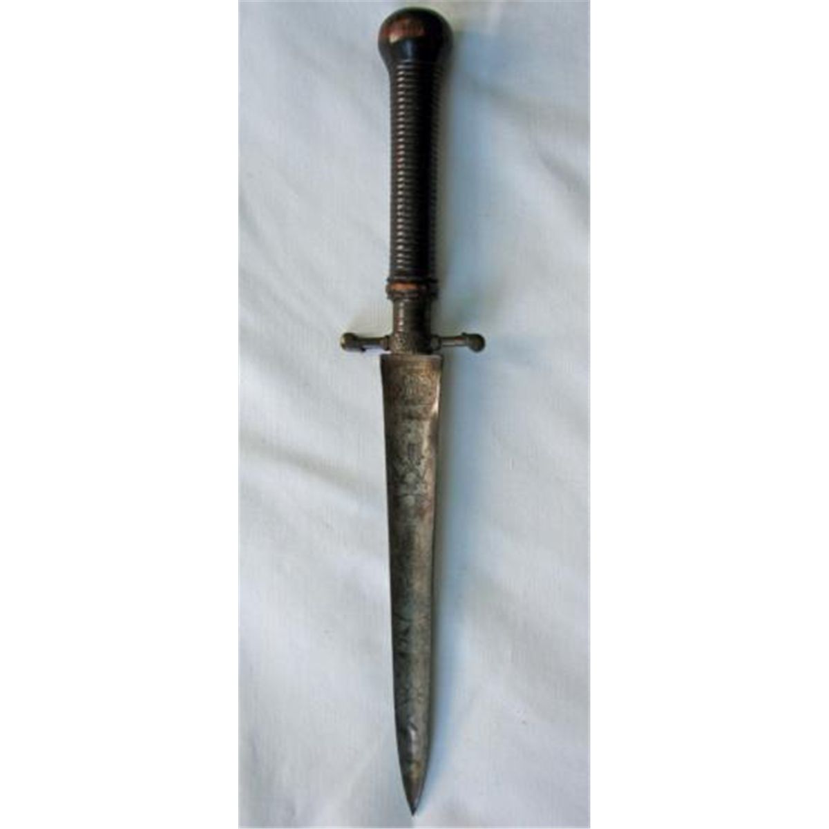 Early 17th Century German armor piercing triangular dirk with fine engraving and fabulous grip. Blade measures 8.5in, overall length 14.5in.