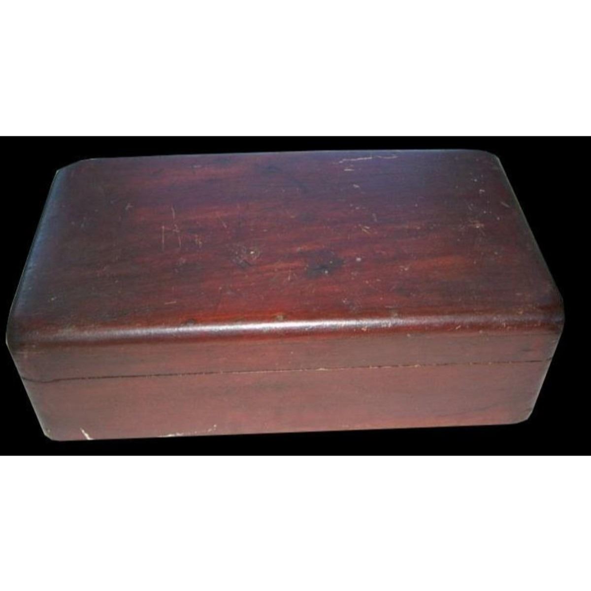 Brass hinged walnut box, has been cut down to accommodate the storage of letters & miscellaneous belongings. The inside of the lid has a sheet of glass, as if to function as a frame. 12" X 7" X 2". *small ink spills