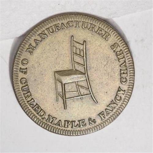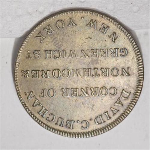 <B>Early 1828-31 New York U.S. Merchant Token.</B></I> Rulau NY-139, R.7, Choice XF. Issued by David C. Buchan, who manufactured curled maple and fancy chairs in New York in the early 1820s. With the misspelling Northmoore instead of Northmore, and as Low-226. <BR><BR><b>Shipping:</b> Coins & Currency (<a target="_blank" href="http://www.heritageauctions.com/common/shipping.php">view shipping information</a>)