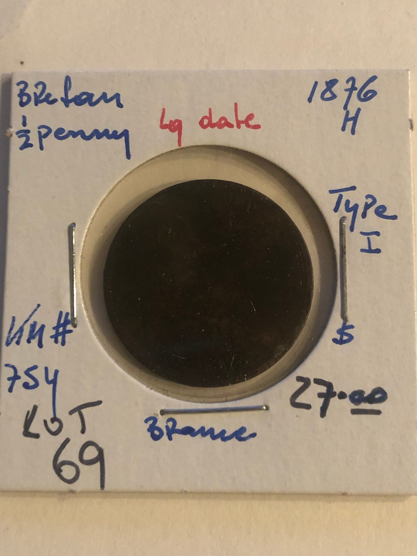 Early 1876H Type I Large Date Great Britain 1/2 Penny