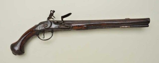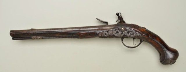 Early 18th century Flintlock Horseman's size pistol of central European mfg. with iron mounts, pierced side plate, banana shaped lock and approx. 21" overall with 13-1/2" barrel of 69 caliber. The metal surfacesshow a dark brown patina finish and the pistol is in its original configuration with proper hammer and small parts. The stock shows a break and repair at the wrist, some losses around pin holes and would be rated at fair to good with need of slight restoration. The pistol retains a period ramrod, the side plate is nicely pierced and chiseled and the butt plate and trigger guard show good work. Circa about 1725 this isthe type imported to Colonial American and used by early settlers. Est.;$1,250-$2,500.