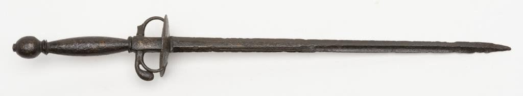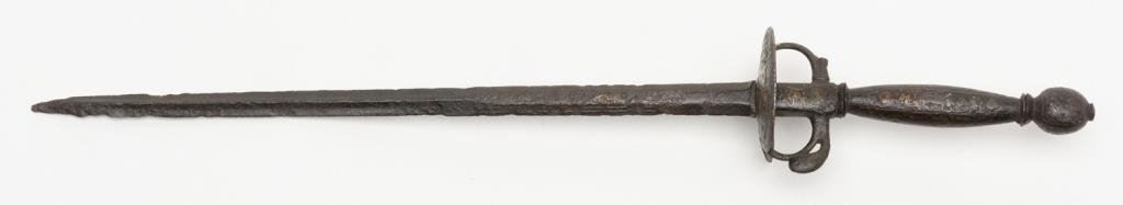Early 18th century small sword shortened to left handed dagger during period of use. Measures 20 “ overall with a 14” blade. Finely silver and gold inlaid. Heavily rusted and like Little John’s curly hair – just a memory of faded glory. Est.: $200-$400