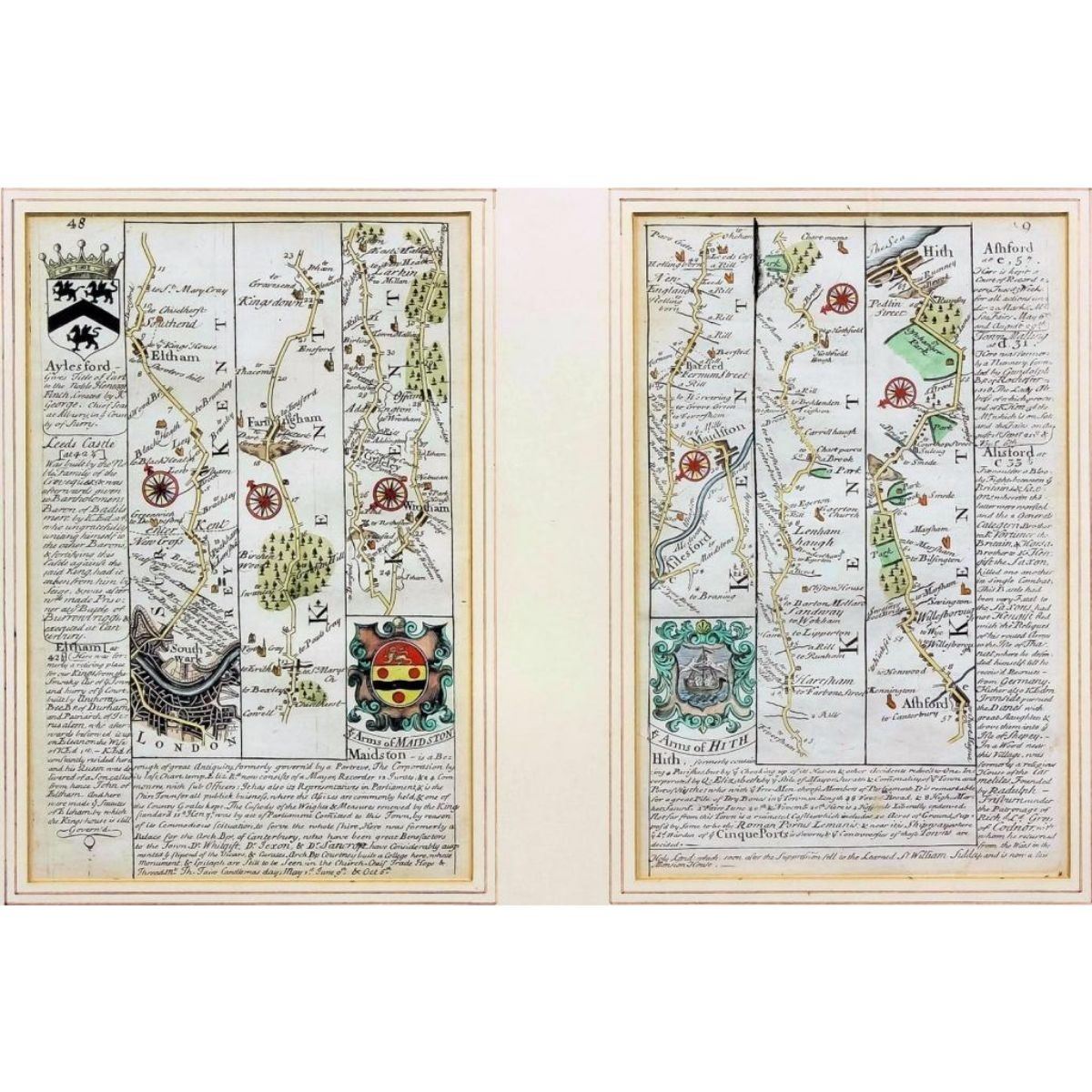 Original early 18th century engravings, Emanuel Bowen ( 1714 - 1767 ) "Map of the Road from London to Dover in Kent". 7 1/4" X 9 3/4" along with "Map of the Road from London to Hith." 7 1/4" X 4 3/4".Â