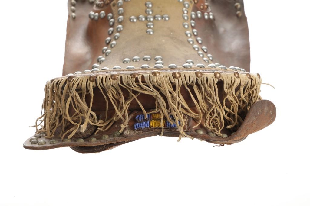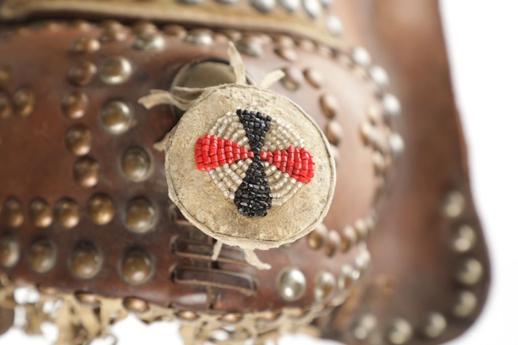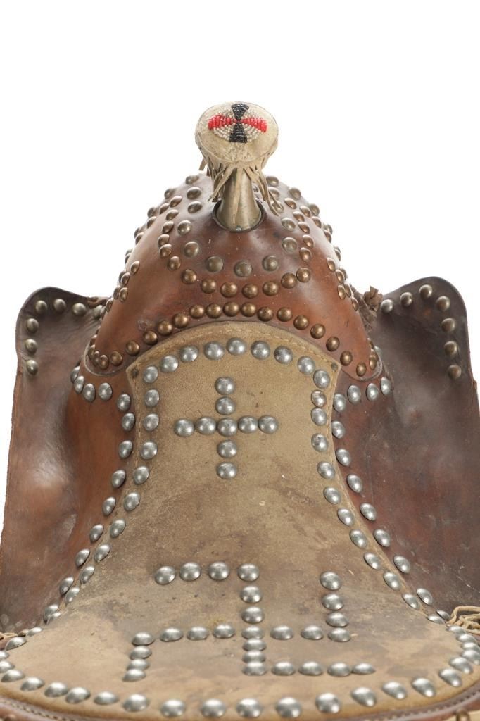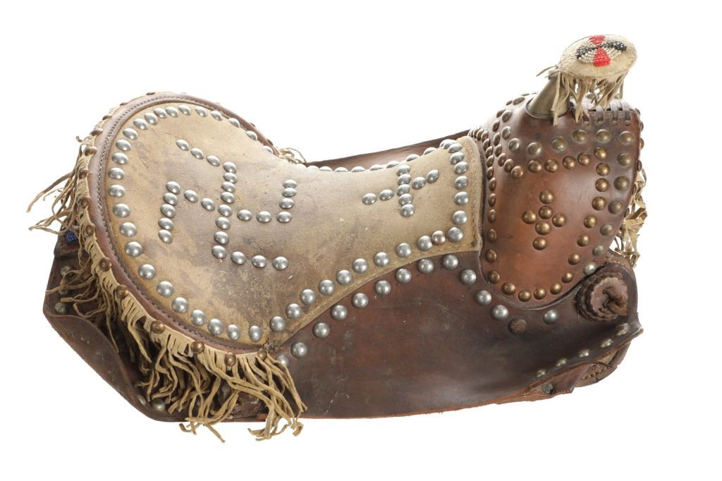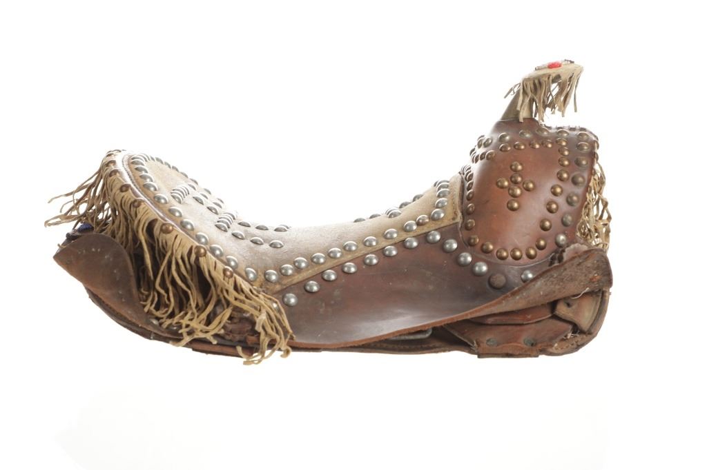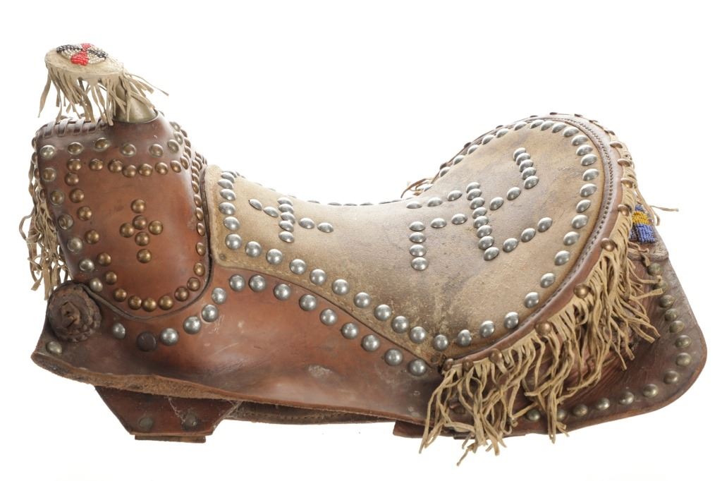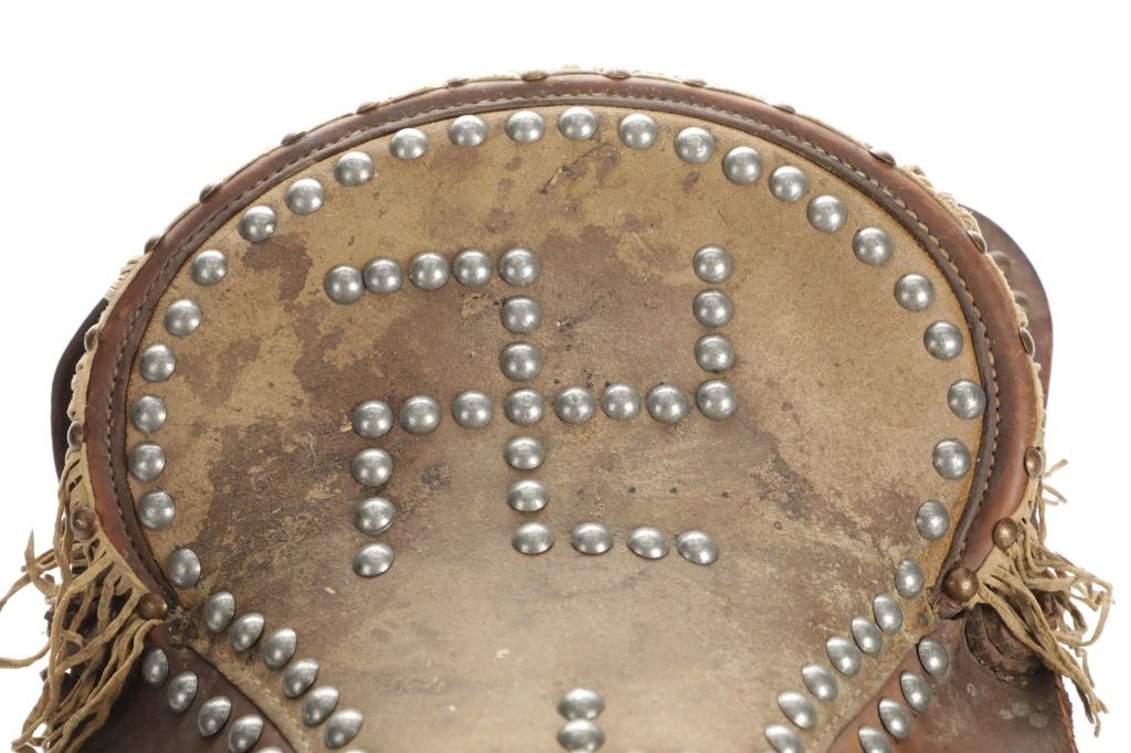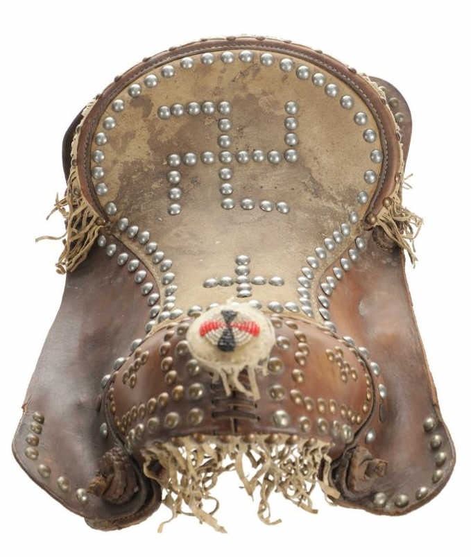 The lot features a unique early 1900’s pony saddle with whirling log tacking, beadwork and Indian hide fringes from the Comanche Indians of Fort Sill, Oklahoma from the ex-collection of Jim Aplan and Cyrus Eaton. The saddle is comprised of an early American pony saddle showing a thin tall pommel swell with solid nickel silver horn with sued leather covered seat having a high cantle with slight squat along with a square skirt having rounded edges and gullet underside with no lining. The entire saddle has a metal and brass covered tacked pattern showing crosses, bands and a large whirling log symbol on the seat. The metal tacks are worn in the seat and skirt areas with brass showing on the horn and rear. The horn, gullet pommel swell, cantle and rear of skirt are trimmed in Indian tanned hide with frilly fringes secured with hoof glue and tacking and accented with early 1900’s glass trade pony and faceted beads with colors of greasy yellow, light blue, semi-transparent pink, black, red and semi-transparent. The Comanche, Apache, Navajo and Pueblo were documented as using the “swirling logs” or “whirling logs” symbol which pre-dates the later WWII German symbol. Provenance: Collected from the Comanche Indians by Jim Aplan of Piedmont, South Dakota in the mid-1900’s and later sold to Cyrus Eaton of London, England in the 1980’s. The saddle has stiffening of the leather along with some wear but overall displays well. Measures overall 17”L by 12.5”W by 8.75”H with the seat being approximately 10.5” to 11”.