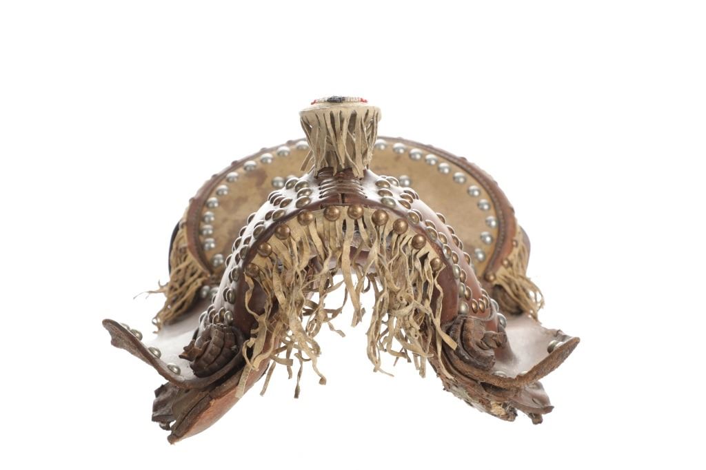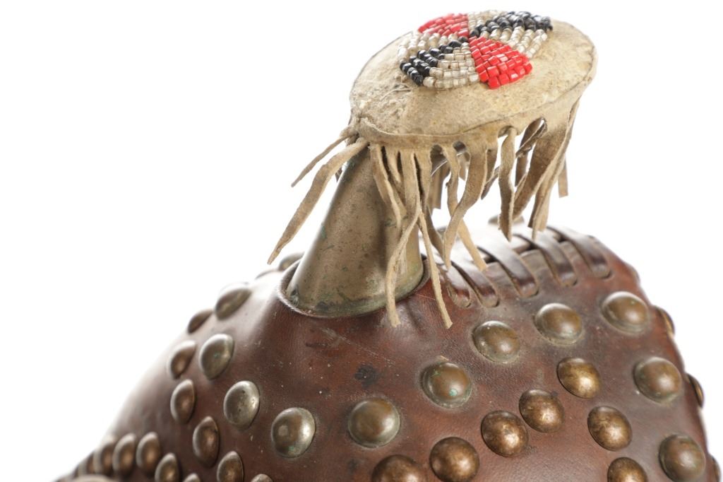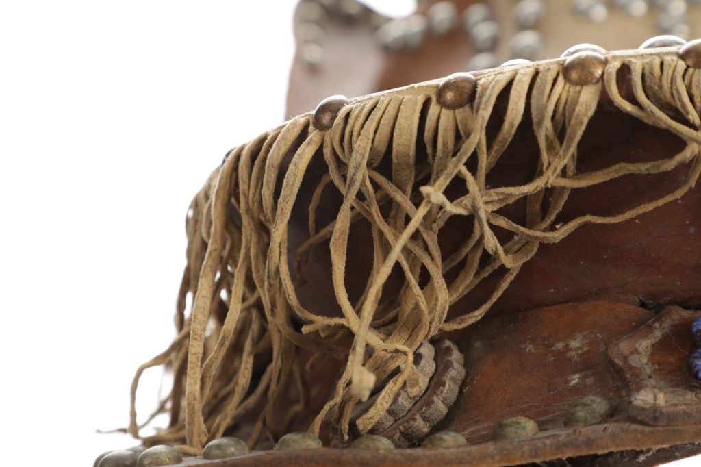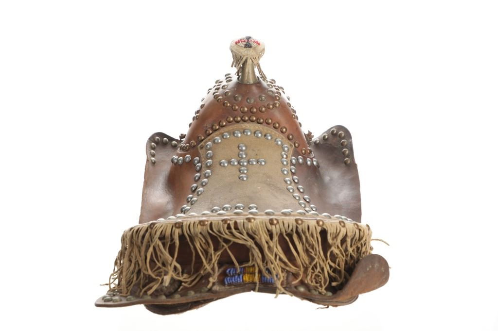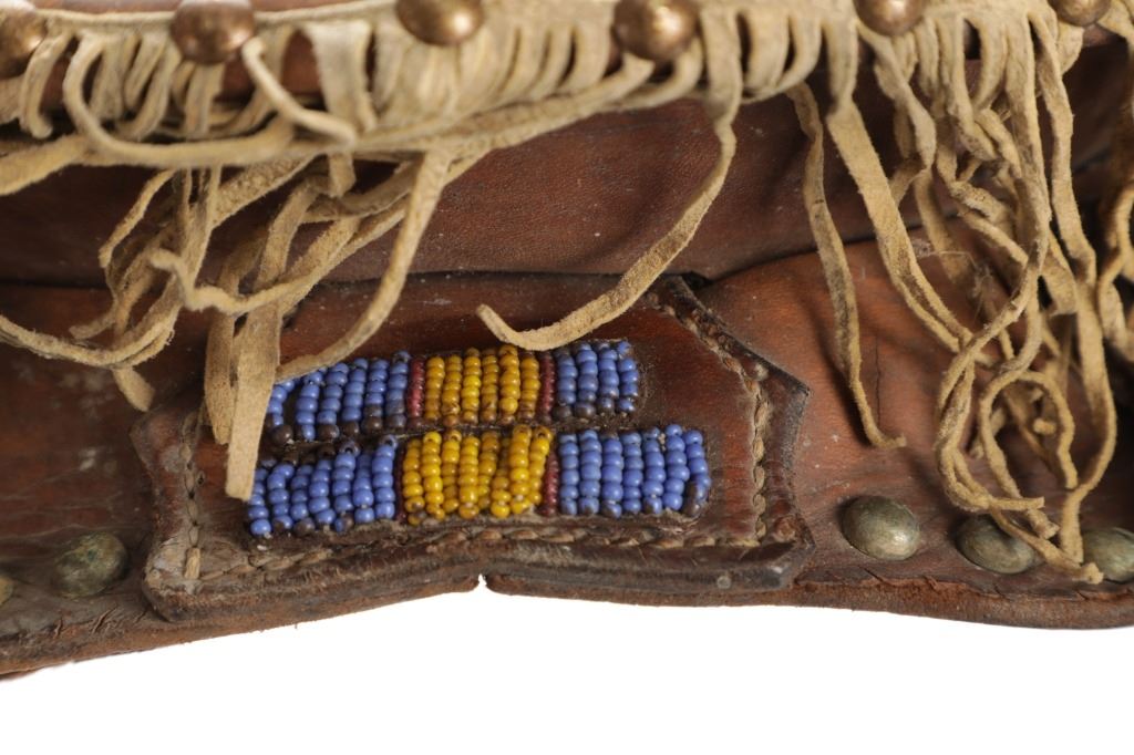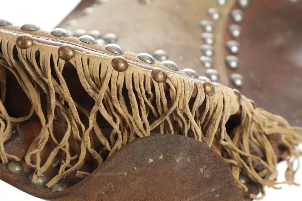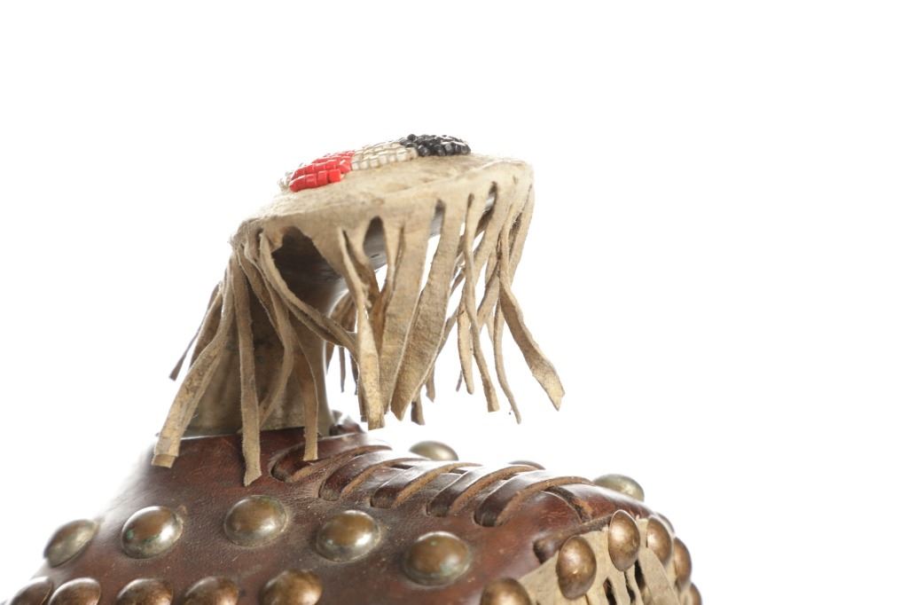 The lot features a unique early 1900’s pony saddle with whirling log tacking, beadwork and Indian hide fringes from the Comanche Indians of Fort Sill, Oklahoma from the ex-collection of Jim Aplan and Cyrus Eaton. The saddle is comprised of an early American pony saddle showing a thin tall pommel swell with solid nickel silver horn with sued leather covered seat having a high cantle with slight squat along with a square skirt having rounded edges and gullet underside with no lining. The entire saddle has a metal and brass covered tacked pattern showing crosses, bands and a large whirling log symbol on the seat. The metal tacks are worn in the seat and skirt areas with brass showing on the horn and rear. The horn, gullet pommel swell, cantle and rear of skirt are trimmed in Indian tanned hide with frilly fringes secured with hoof glue and tacking and accented with early 1900’s glass trade pony and faceted beads with colors of greasy yellow, light blue, semi-transparent pink, black, red and semi-transparent. The Comanche, Apache, Navajo and Pueblo were documented as using the “swirling logs” or “whirling logs” symbol which pre-dates the later WWII German symbol. Provenance: Collected from the Comanche Indians by Jim Aplan of Piedmont, South Dakota in the mid-1900’s and later sold to Cyrus Eaton of London, England in the 1980’s. The saddle has stiffening of the leather along with some wear but overall displays well. Measures overall 17”L by 12.5”W by 8.75”H with the seat being approximately 10.5” to 11”.