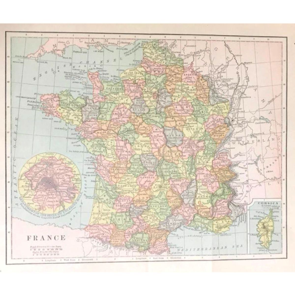 Early 1900's fold-out atlas map of France, showing Corsica & Department of The Seine. 10" X 12".