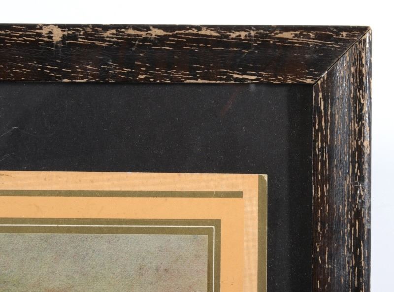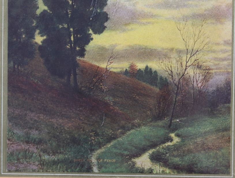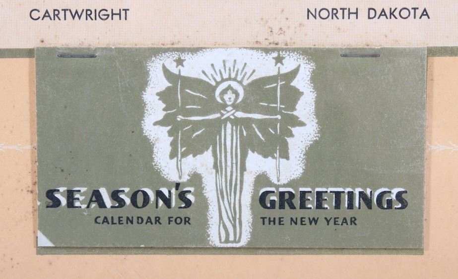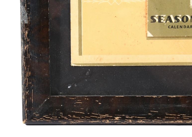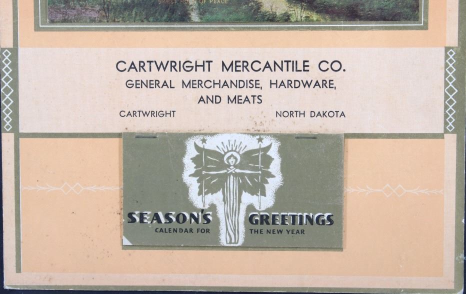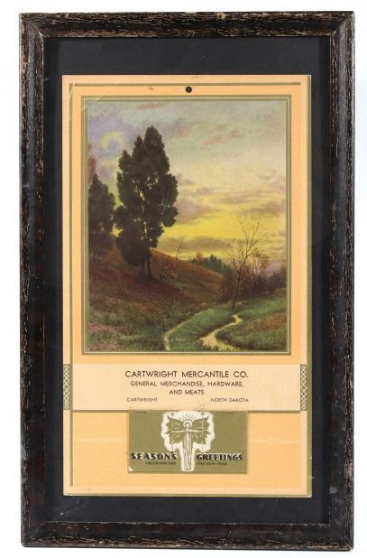 Available in this lot we have a Cartwright Mercantile Co. Poster Calendar originating from the early 20th century. The piece shows a print of a peaceful creek traveling past a hillside titled "Sweet Hour of Peace". Below the art the poster is marked "Cartwright Mercantile Co. General Merchandise, Hardware, and Meats - Cartwright North Dakota". At the bottom of the poster is a unused tear away calendar with the front cover reading "Seasons Greetings Calendar for the New Year" with the image of a angelic figure at the center of the cover. The poster is set into a black painted wood frame with a black border around the poster. The piece shows good condition with some minor wear on the poster. The frame measures 13 1/2" wide by 21 1/2" tall with the poster measuring 10" wide by 17" tall.