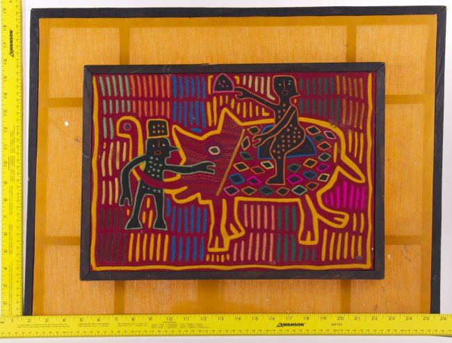 Early 1900's "Elephant Rider", a brilliant colored hand stitched Mola textile. The Mola forms part of the traditional outfit of a Kuna woman, two Mola panels being incorporated as front and back panels in a blouse. Molas have their origin in body painting. Only after colonization by the Spanish and contact with missionaries did the Kuna start to transfer their traditional geometric designs on fabric, first by painting directly on the fabric and later by using the technique of reverse application. It is not known for certain when this technique was first used. It is assumed[by whom?] that the oldest Molas are between 150 and 170 years old. SIZE: see attached ruler photo. Photos are part of the description representing the condition report and can be used for authentication prior to the sale date. Pangaea Auctions urges Bidder's to view all attached photos in detail. #(Central American, 19th-20th Century, Textile, Clothing, Textile, Antique, Vintage, ).