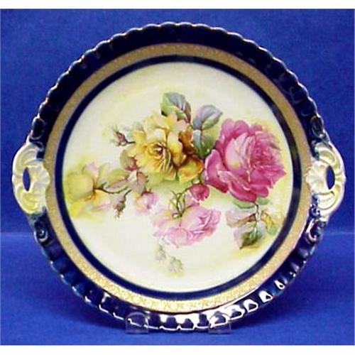 Gorgeous antique plate with two ornate handlesand fine scalloped edge, The border is done in flow blue contrasting rich gold band-circle.Love the exquisite large roses, Very good condition, free of chips or cracksbut for the gold accent around the edge is quite thin, There is no makers mark but for a tiny number 4.To me it looks like R.S. Germany.US Buyer please pay 8.00 for shipping plus insurance.Thank You for looking.
