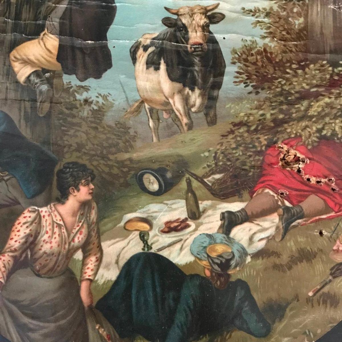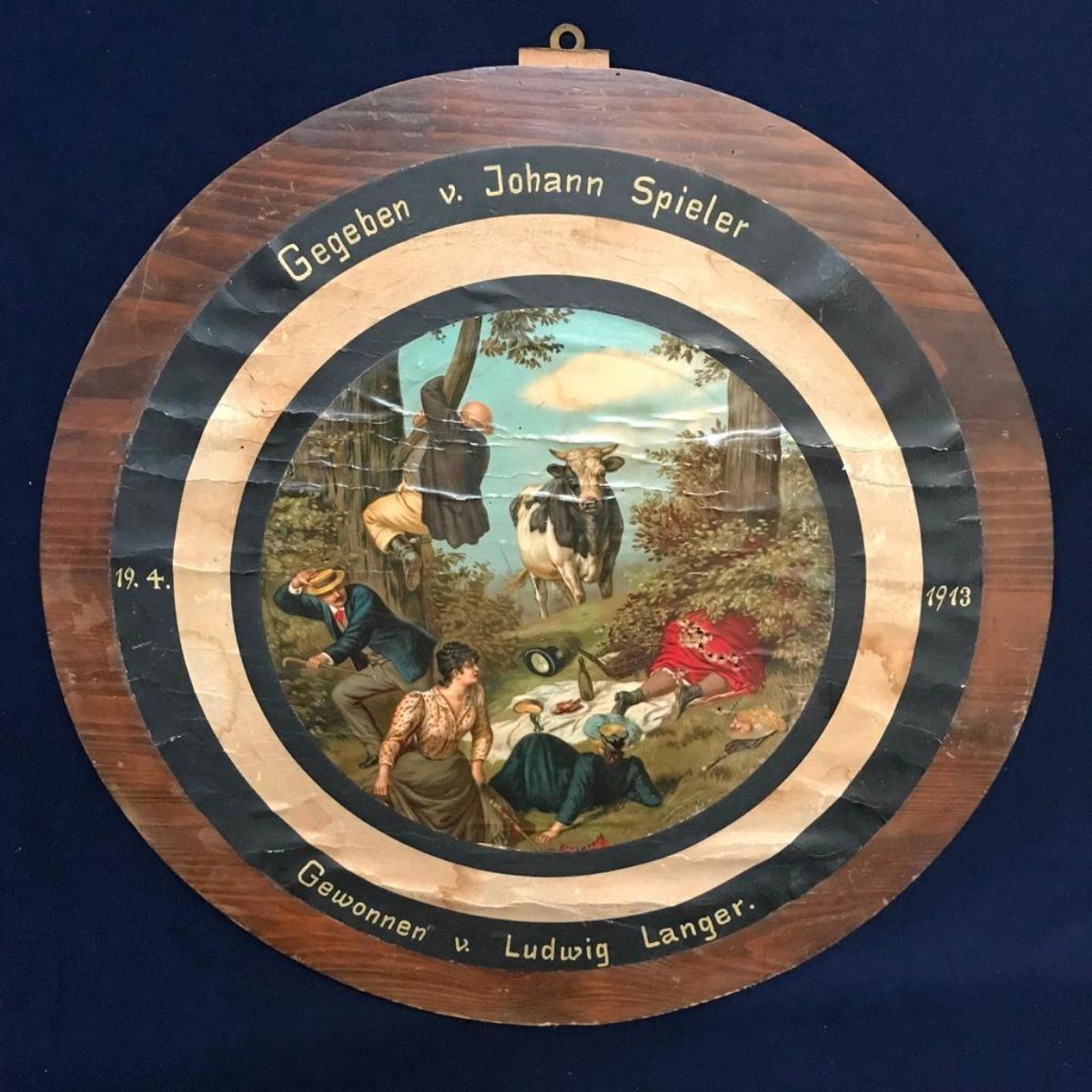 Vintage, early 1900's German target, pub dart board. Black Forrest wooden board, with affixed chromolithograph. 21 1/2" D.