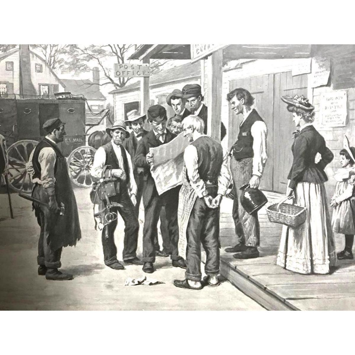 Early 1900's Halftone print, from a book of Drawings by A. B. Frost. "Politics". A group of concerned citizens gather as a postman reads the latest news outside the post office. 10" X 15"