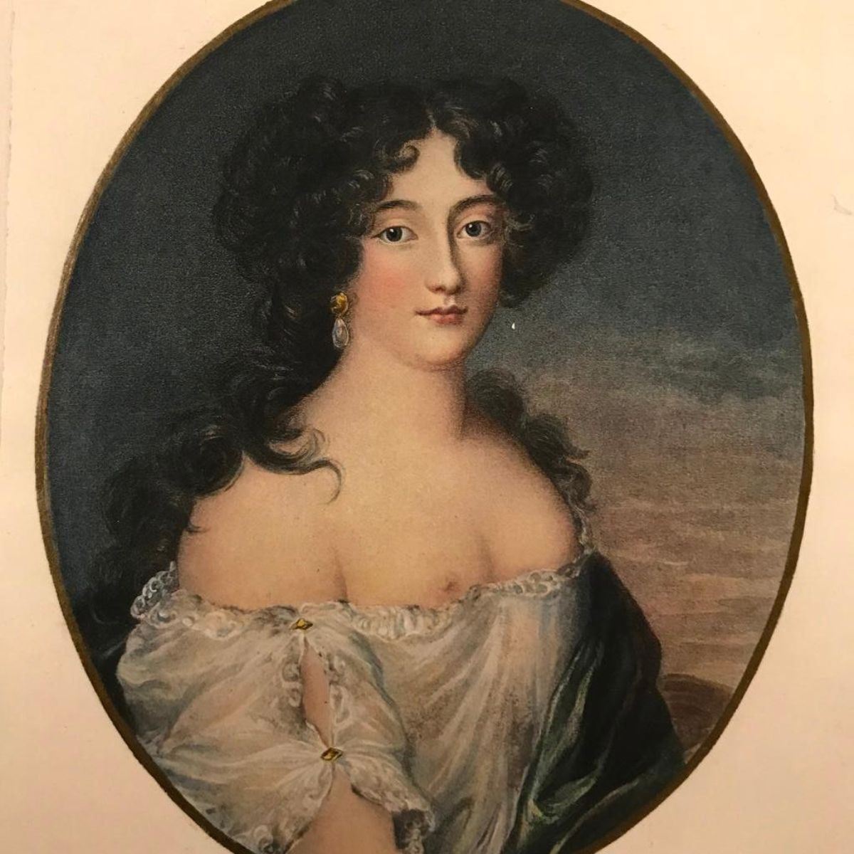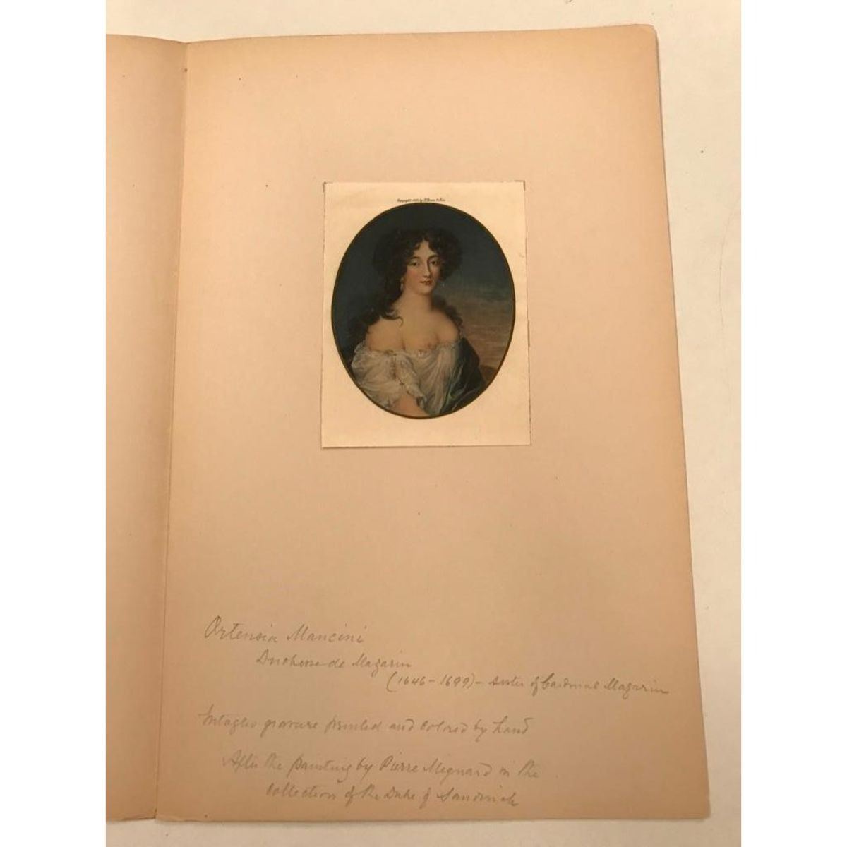 Early 20thc ( c 1903 ) hand-colored intaglio gravure print of the Duchesse de Mazarin. After the painting by Jocob Ferdinand Voet. Presented in an ivory colored folio, ready for framing, with a handwritten description. Beautiful portrait of a 17thc Italian lady of the court. Hortense Mancini, Duchesse de Mazarin ( 6 June 1646 – 2 July 1699 ), was a niece of Cardinal Mazarin, chief minister of France, and a mistress of Charles II King of England, Scotland and Ireland. She was the fourth of the five famous Mancini sisters, who along with two of their female Martinozzi cousins, were known at the court of King  Louis XIV of France, as the Mazerinettes. She became a favorite at the court of Charles II & well known for her love affairs. She was one of the first women in France to put her memoirs into print. * The last photo shows the famous Duchess with two of her sisters. Â