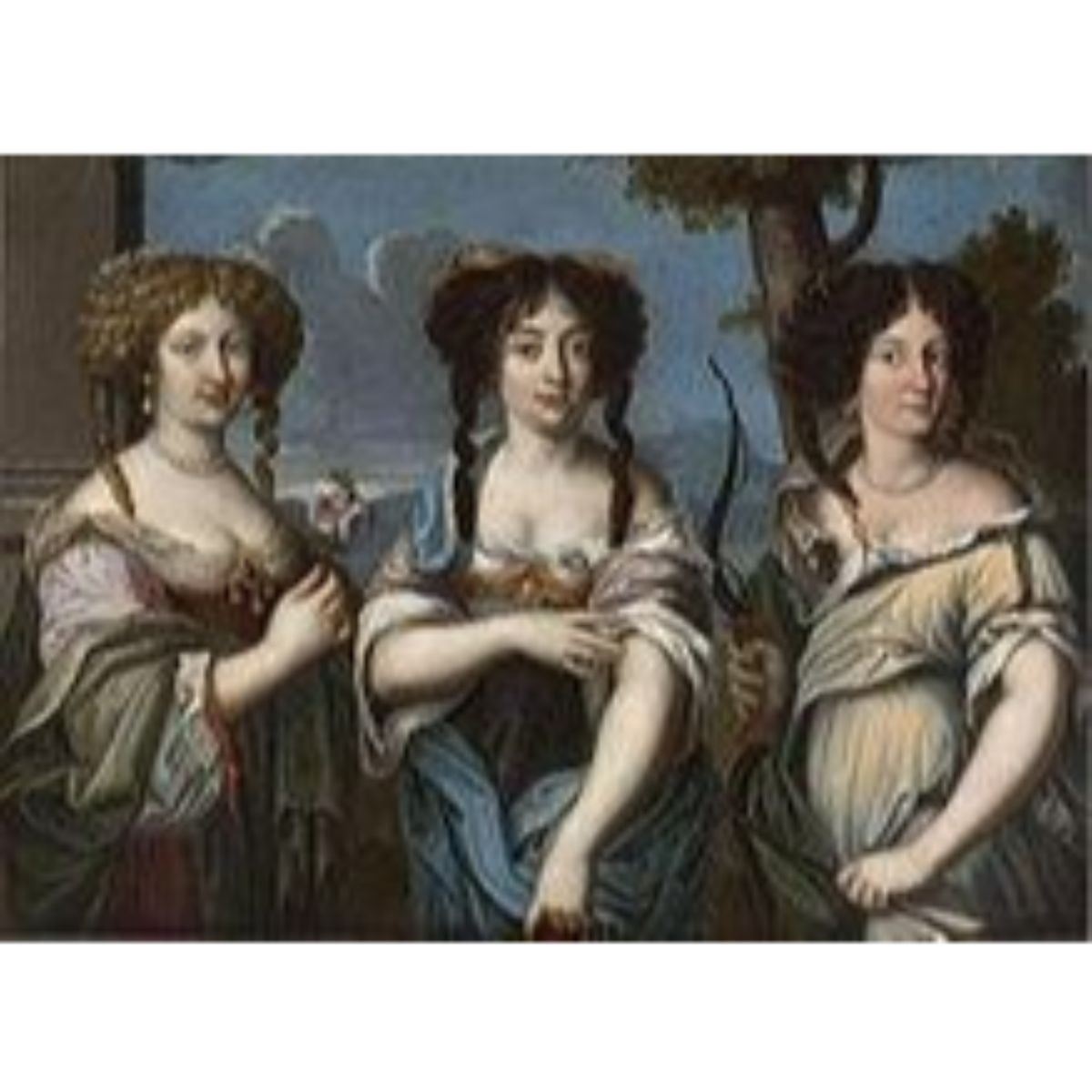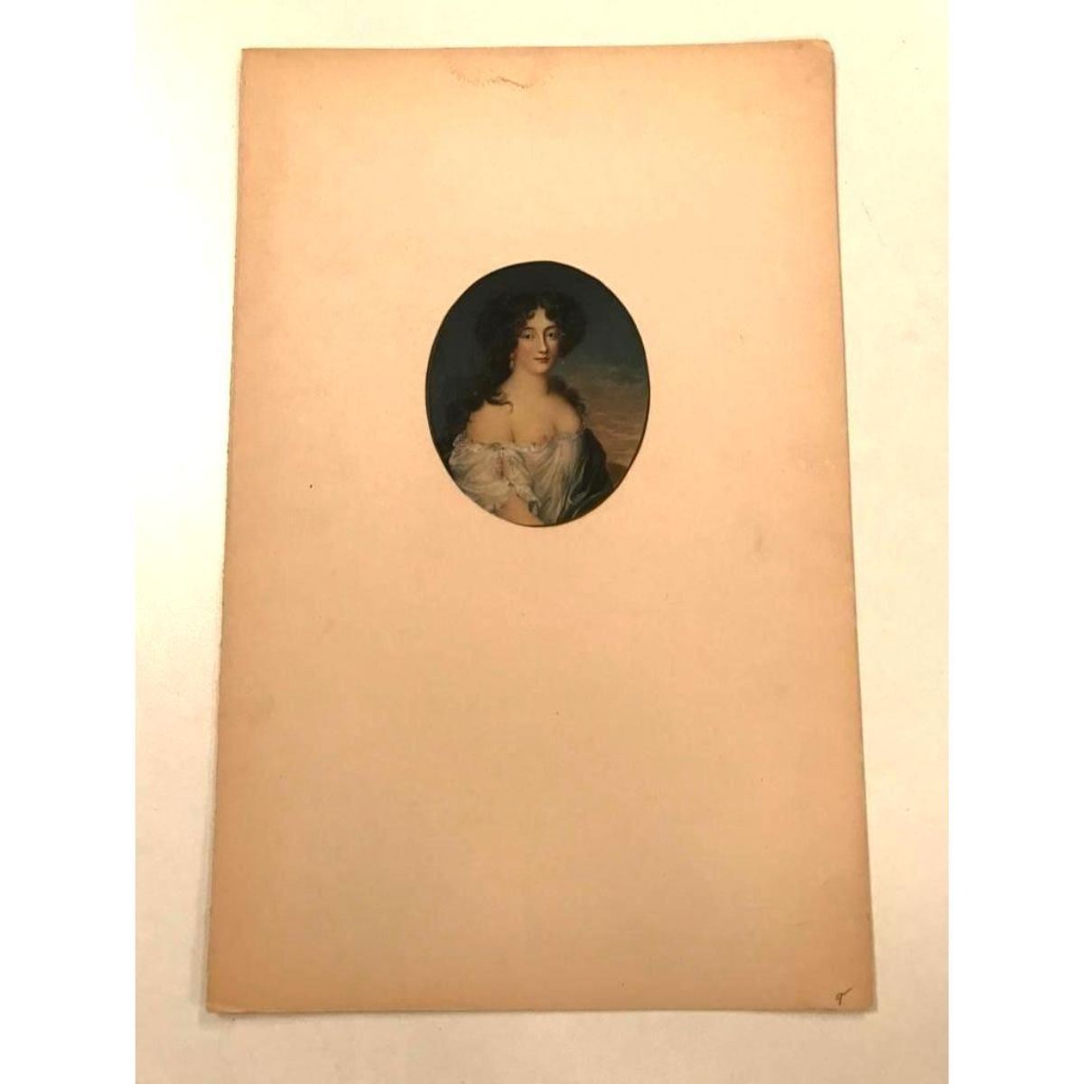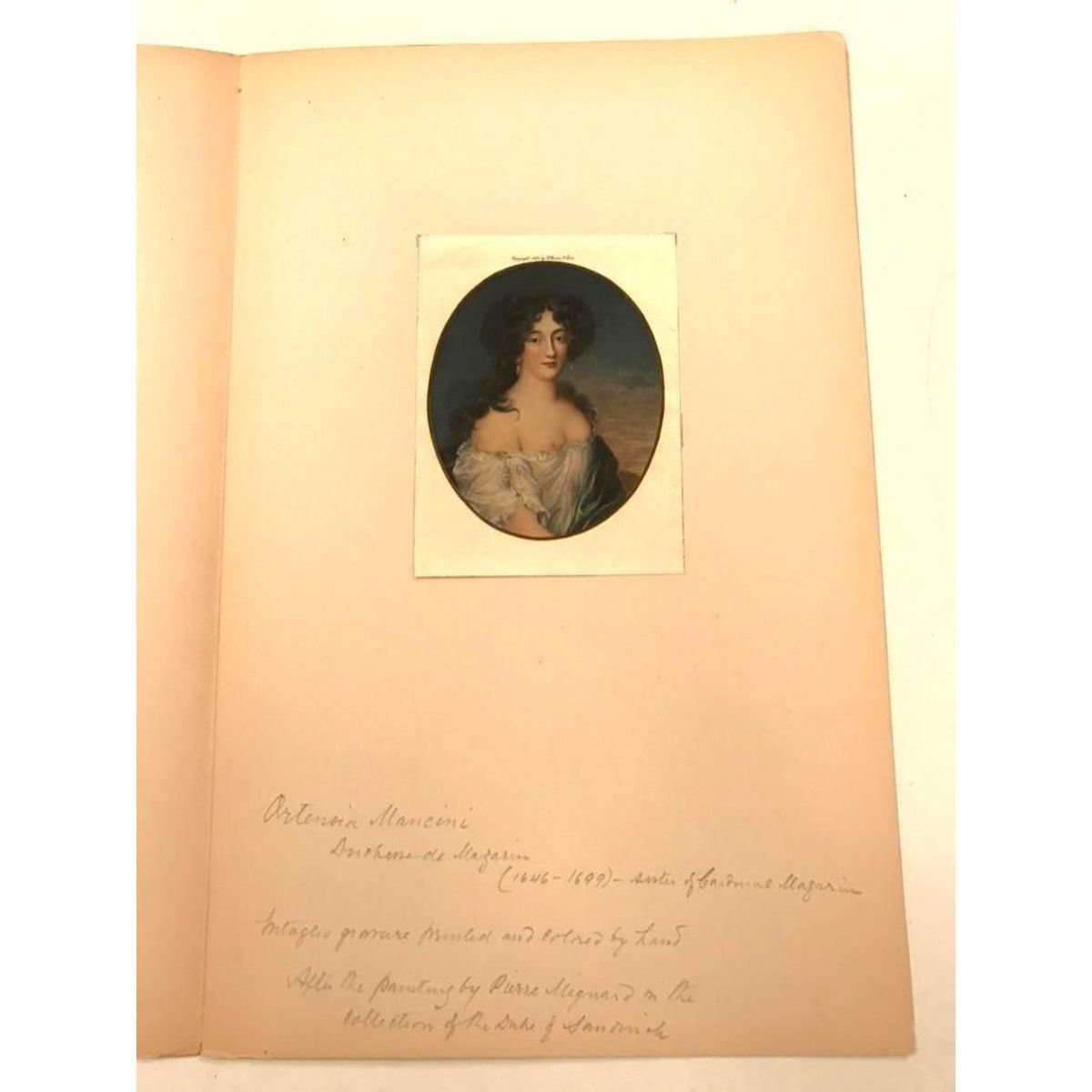 Early 20thc ( c. 1903 ) hand-colored intaglio gravure print of the Duchesse de Mazarin. After the painting by Jocob Ferdinand Voet. Presented in an ivory-colored folio, ready for framing, with a handwritten description. Beautiful portrait of a 17thc Italian lady of the court. Hortense Mancini, Duchesse de Mazarin ( 6 June 1646 – 2 July 1699 ), was a niece of Cardinal Mazarin, chief minister of France, and a mistress of Charles II King of England, Scotland and Ireland. She was the fourth of the five famous Mancini sisters, who along with two of their female Martinozzi cousins, were known at the court of King  Louis XIV of France, as the Mazerinettes. She became a favorite at the court of Charles II & well known for her love affairs. She was one of the first women in France to put her memoirs into print. * The last photo shows the famous Duchess with two of her sisters. Â