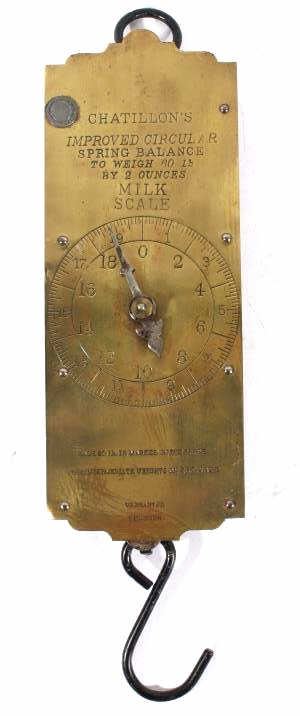 Included in this lot we have a collection of three hanging spring balance scales originating from the early 20th century. The collection consists of three spring balance scales, two Chattillons, and one John Chatillon & sons. The scales shows steel and brass construction with on showing a paper face. The scales where used by grocery stores to weigh products sold by weight, such as milk and dairy. The first two are marked "Chatillon's Improved Circular Spring Balance to weigh 60lb by 2 ounces- Milk Scale- Each 20 lb Is marked on the slide The intermediate weights on the circle - New York". The third piece is marked across the face "John Chatillon & Sons New York U.S.A. Improved Spring Balance". The scales show good condition overall with some wear indicative of age and use. The largest of the scales measures 16 1/2" long by 4 1/2" wide, with the third showing a diameter of 7".