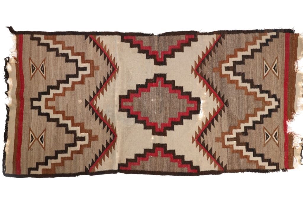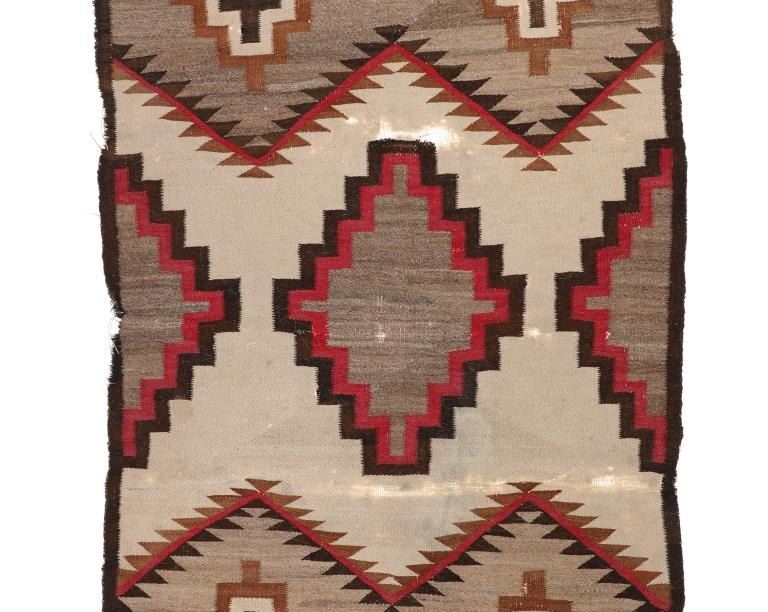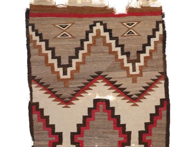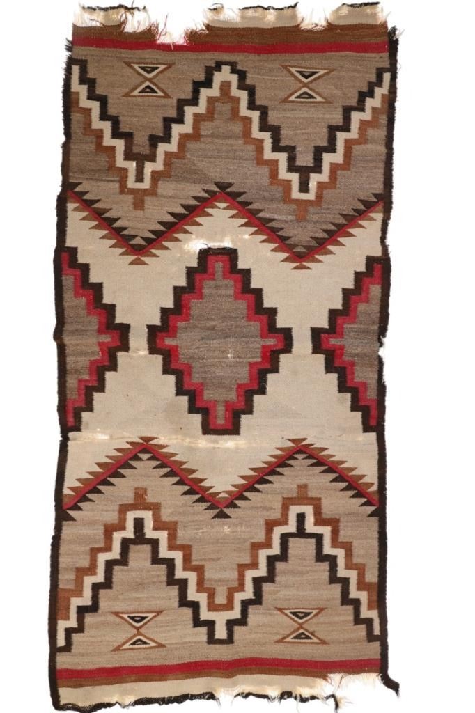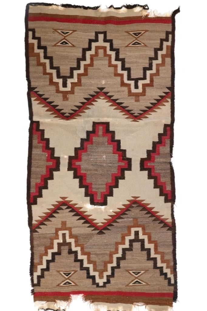 This is a fabulous early 1900’s J.B. Moore Navajo Old Crystal wool rug from a private-Montana collection. The rug exhibits some natural hand-spun wool with natural and aniline dyes with colors of red, browns, white / creams, tans, grey. J.B. Moore was a native of Sheridan, Wyoming and bought an interest in the trading post at Washington Pass, N.M., also known as Cottonwood Pass, in 1896. The Crystal Trading Post was established in 1896 by Moore on the Navajo Reservation in far western New Mexico, high up in the Chuska Mountains. In 1897, JB Moore purchased the entire interest in the trading post and renamed it “Crystal” after a “pure and sparkling mountain spring that ran by the post.” The remoteness and limited winter business led Moore to issue mail order catalogs in 1903 and 1911, selling Navajo rugs to people in the eastern U.S. Moore had a strong interest in Navajo weaving and was "instrumental in promoting a bordered rug style, more suited to the tastes of Anglo buyers." Early Navajo Crystal rugs from the 1903 catalog were often made from natural hand-spun wool yarn and featured traditional Navajo weaving patterns common in the last quarter of the nineteenth century. He abruptly left the Navajo Reservation in the autumn of 1911. This rug shows a nice weave with lazy lines throughout and nice variation of color and fine early Crystal detailing. The rug shows some loss to the weave, a few small worn spots, and edge damage, but overall still a stunning rug with impressive colors and well matched on both sides. Measures 71-inches long by 34-inches wide.